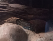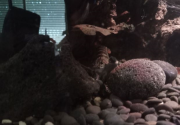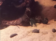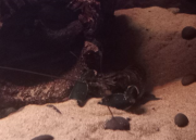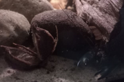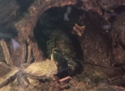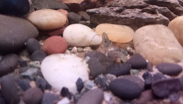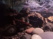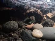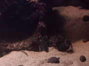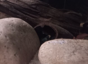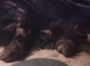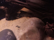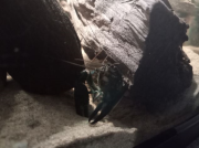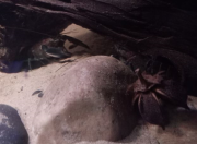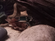 Zhaïtan ne venait pas réclamer de nourriture depuis 2 jours, et il passait son temps enterré dans le sable de basalte avec seulement les yeux qui dépassent, très inhabituel pour lui. Soo-Won bizarrement a emménagé dans le trou juste à côté au lieu de rester dans 'sa' moitié de l'aquarium. Je me suis donc dit que la mue approchait peut-être puisqu'elles arrêtent de manger lorsqu'elles se préparent. Et ça n'a pas loupé, il a mué hier soir!