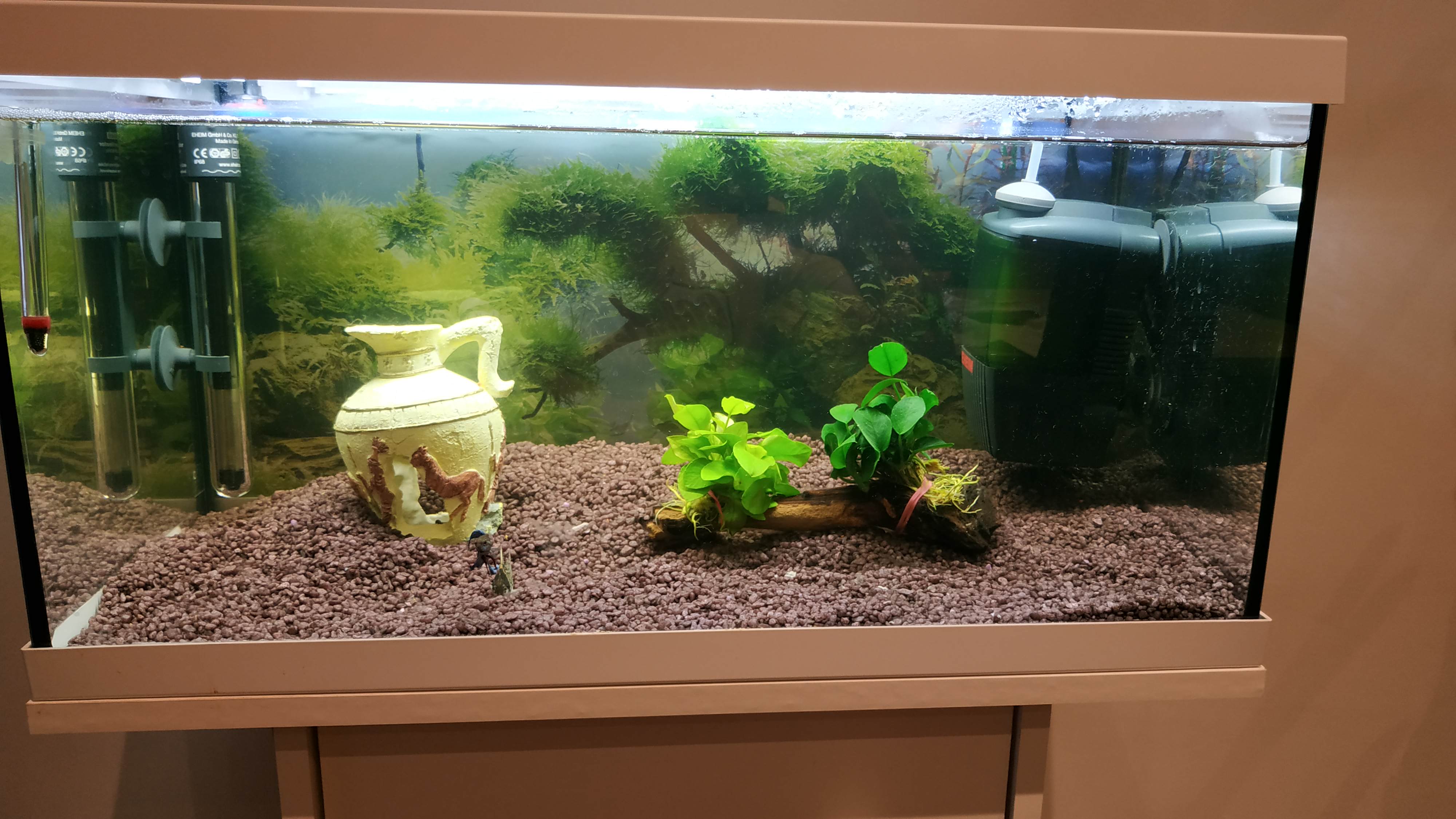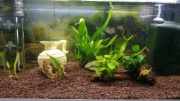 IMPORTANT : vous remarquerez qu'il y a un betta et un corydora. Je sais que c'est trop tôt pour incorporer des poissons mais ceux là viennent de l'aquarium de mon frère qui s'est brisé.. donc c'était ça ou ils étaient vouer à une mort certaine... Sinon j'ai un tapis bulles à la surface de l'eau et une multitude de micro bulles ailleurs et je n'en connais pas la cause