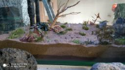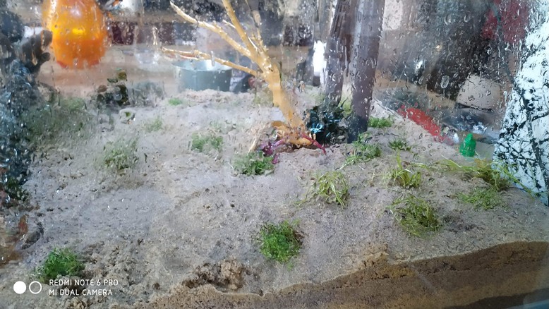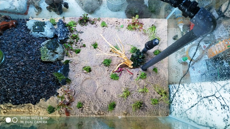 voila nouveau départ ayant mis l'idée de déco avec du bois récuperé a droite a gauche mise à a la poubelle. démarrage en DSM , j'espere que les plantes vont trouver leur chemin a travers les 4cm de sable , je n'ai pas mouillé pou avoir 1 cm d'eau dans le fond j'arrose généreusement donc ca va se faire . il me manque de puzzolane pour faire mon projet complétement ( vive le déconfinement sinon j'ai qqes paniers en attente sur diverses sites ) . je m'inquiete un peu pour l'anubias posé sur un pied de vigne ( pas visible ) humidifiée comme le reste .