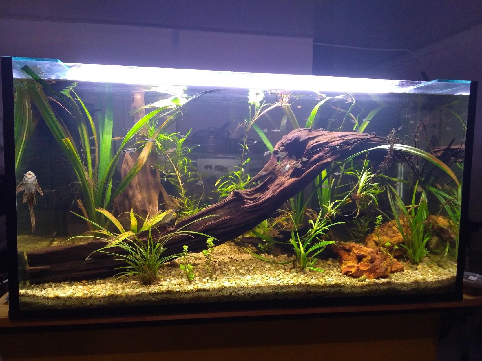 J'ai pour l'instant un bac de 200l "classique" (pompe avec filtre et éclairage led) peuplé et décoré à partir de mes trouvailles en rivière guyanaise. Mais j'ai également d'autres projets en tête : grand bac en verre et bois, paludarium avec notamment des plantes épiphytes... et pourquoi pas un jour m'essayer à l'eau salée!