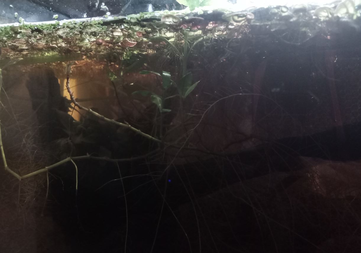 Mon bac bien planté ne l'est plus, la plupart des plantes ont fini par capoter. Il reste des anubias et buces, des vallisneria et surtout des plantes qui se sont extériorisées et ont donc fait de grandes racines dans l'aquarium. Je l'aime bien quand même comme ça. Mon petit Alien par contre a fait une indigestion fatale (de bébés crevettes et autre microfaune sans doute). @Kracmak Du coup l'eau saumâtre ne devrait pas poser trop de problèmes aux plantes qui restent. Petit tour du bac :