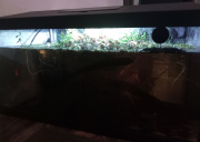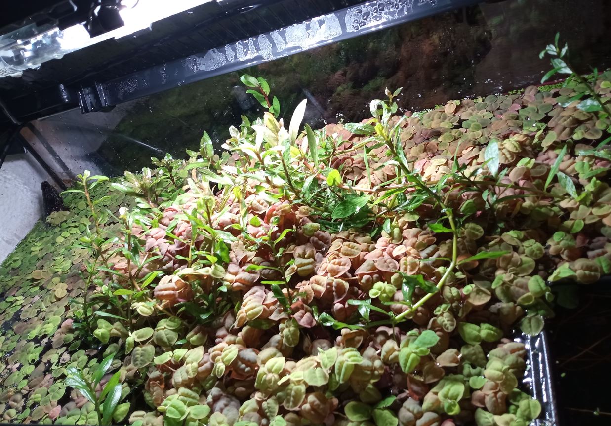 Je ne sais pas si ça rentre ici mais le bac est relativement nouveau ^^ Il s'agit de mon bac 60L low tech (pas de filtre) pour mon betta alien. Pour le moment pas de problème à signaler, il est habité par un betta alien green mâle (il y a eu quelques doutes sur sa masculinité sur le forum betta mais on verra bien) d'environ 2 mois qui est arrivé le 05/09, 3 japonicas mâles - j'ai dû retirer la femelle qui martyrisait le jeune betta - et une poignée de néos déclassées de couleur complètement neutre allant du noir/marron au gris pâle. A cela s'ajoute de la micro-faune (aselles, blackworms, ostracodes, cyclops) et des escargots physes et planorbes. Il est recouvert de flottantes.