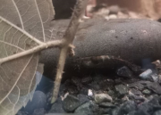Sinon il fait un truc un peu bizarre - je ne sais pas si c'est du 'jeu' ? Lorsque je touche la vitre avec mon doigt là où il a son nez, il s'enfuit à la vitesse de l'éclair. J'ai pensé qu'il avait peur. Sauf que maintenant il revient immédiatement au même endroit (il est extrêmement rapide, on dirait qu'il disparaît!), il se remet dans la même position et il attend. Si je remets mon doigt il le refait, et il peut faire ça autant de fois que je mets le doigt. Ce qui lui fait de l'exercice. Et parfois il ne part pas, ce qui me fait penser qu'il n'a pas si peur que ça en réalité... Si je tapote la vitre il vient vite, même s'il était planqué dans la partie jungle de l'aqua. Il adore aller se mettre sous les feuilles mortes du sol. Les crevettes ne le craignent pas, il ne s'en occupe plus depuis que la grosse femelle jap a déménagé.