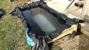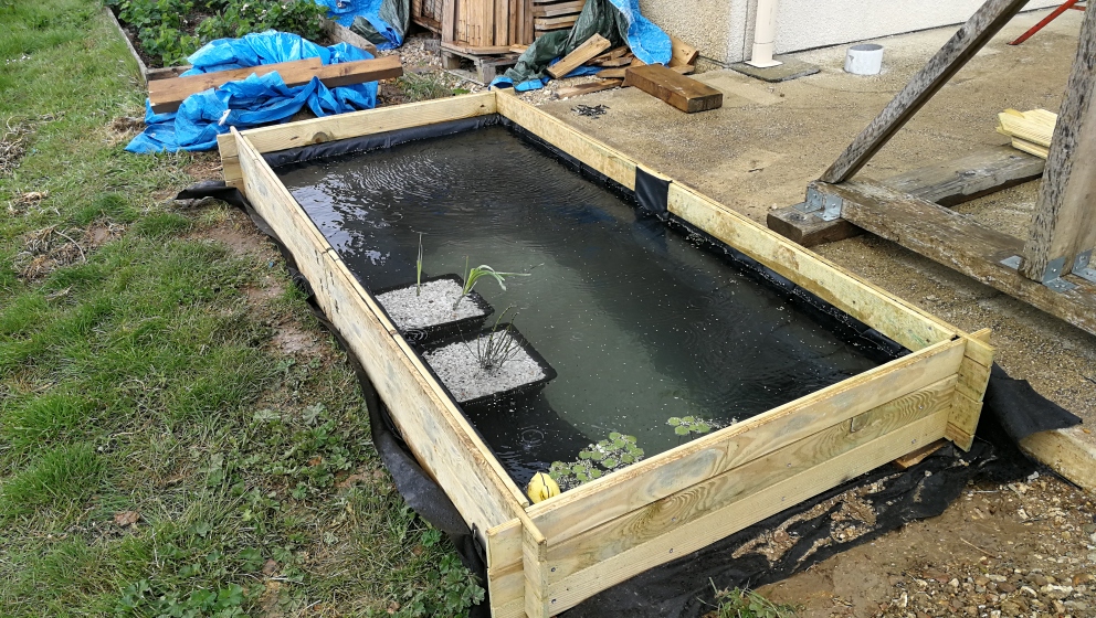 J'ai pas revérifié les dimension précisément mais ça donne environ 180L x 60l x 90h. La largeur au niveau du palier est de 80 ou 90cm. Ça dépasse le m3. Je viens de faire un ensemencement maison. J'ai mis quelques verres contenants du mulm du bac à daphnies, des daphnies et autre larves de moustiques, et des escargots. J'ai aussi mis des lentilles d'eau et grenouillettes mais il va pleuvoir les 3 prochains jours du coup c'est pas dit qu'elles tiennent... L'eau sent le plastique de la bâche, du coup j'avais l'impression de renifler une mauvaise gourde neuve... Jai commandé un petit filtre cascade. Pas sur que je laisse les masses filtrantes, je vais peut être les remplacer par de la pouzzolane et des plantes, je verrais bien.