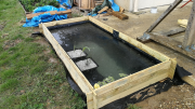 OK ok ça va j'ai compris ;-). Je profite de quelques morceau de bastaing qui me reste pour renforcer 3 côtés à hauteur d'eau. Le 4 ème côté terrasse sera bloqué par du calcaire entre la terrasse et le bois.