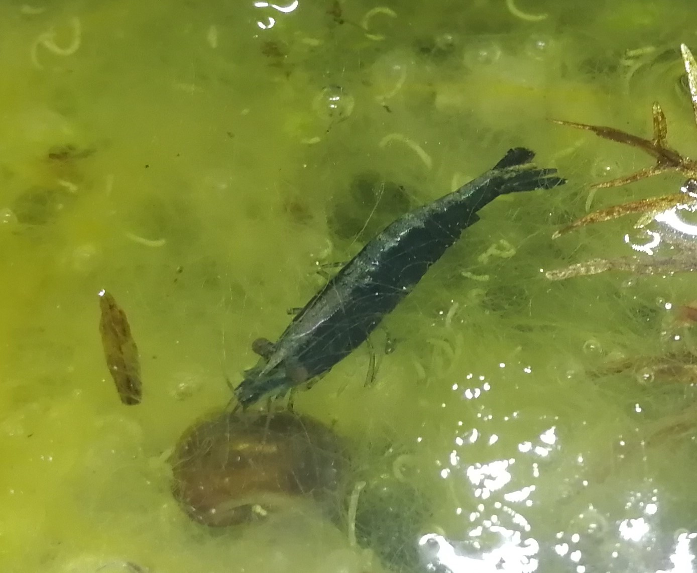Par contre, où sont passées les discrètes formes sauvages que j'avais commandées, celle-ci est d'un beau bleu marine (ça ne se voit pas trop sur la photo) ? Ou peut-être est-ce une descendante, une des crevettes d'origine était grainée à la réception...