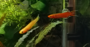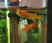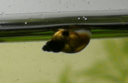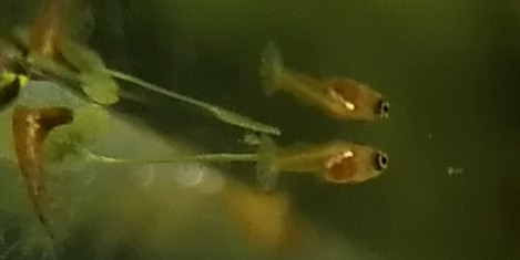 J'ai revu un alevin ! Peut-être le même. Je n'ai pas eu le temps de prendre de photo, il s'est caché dès que j'ai bondi du canapé... Il était beaucoup plus grand et plus sombre, quoiqu'encore transparent, j'ai distinctement vu un triangle foncé sur la caudale bien développée, et il était beaucoup plus vif !
