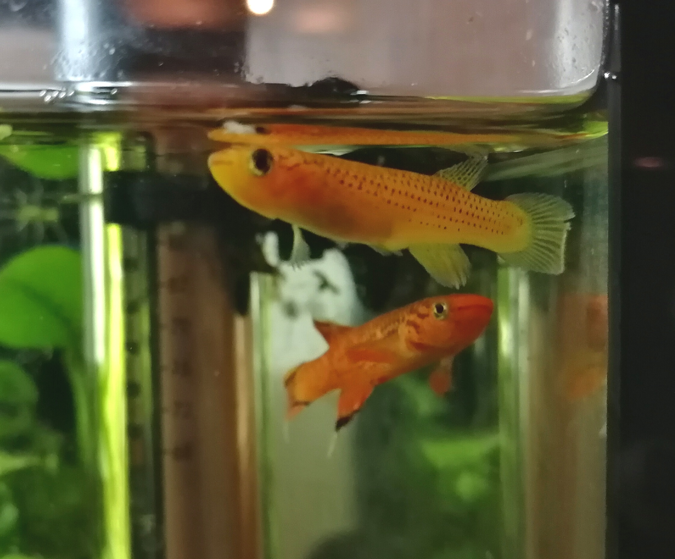 Les crevettes doivent être cachées, je n'en vois aucune mais je ne vois pas de cadavres non plus... Et les killies sont bien nourris de drosophiles. À part ça, ils n'ont pas perdu de temps : Madame est pleine d'œufs et tout à l'heure Monsieur tentait de s'accoupler avec elle. Faut dire qu'il la collait tellement ces derniers jours qu'elle restait cachée presque tout le temps ; il faut vraiment que je leur ajoute une copine afin que Monsieur partage ses ardeurs entre elles.