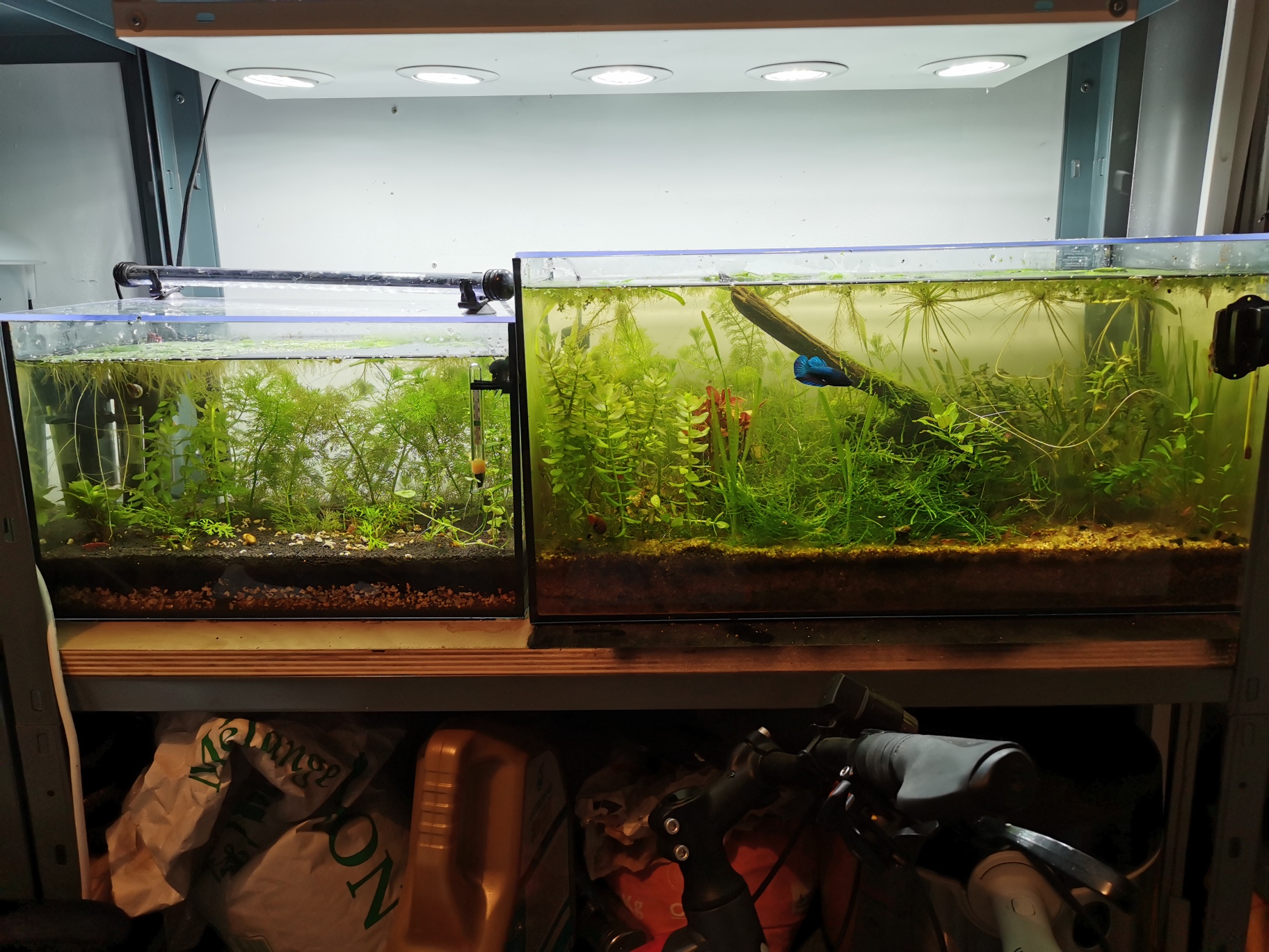 Un Betta Crowntail pour mon 25L et un Plakat pour le 54L. A priori j'ai fait des heureux. Après 1 ou 2 heures à se cacher car toutes ces nouvelles choses dans le paysage font peur, ils ont commencer à explorer leur nouvelle maison. Et vas-y que je fais des allers-venus dans le bac et passer dans le moindre interstice entre les plantes, j'ai d’ailleurs du faire une grosse taille dans les deux bacs pour qu'ils puissent se mouvoir un peu  ... Et vas-y que je parade devant les escargot et les crevettes des fois qu'elles décident de se jeter sur moi  ... Avec tout ça j'avais oublié que les deux aquarium sont collés et que nécessairement ils allaient se rencontrer... Bah ils étaient pas content et tapaient des sprints en paradant comme des dingues. J'ai fini par mettre un bout de carton entre les deux...