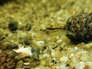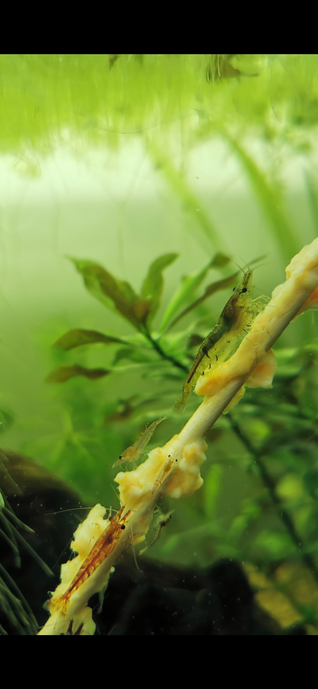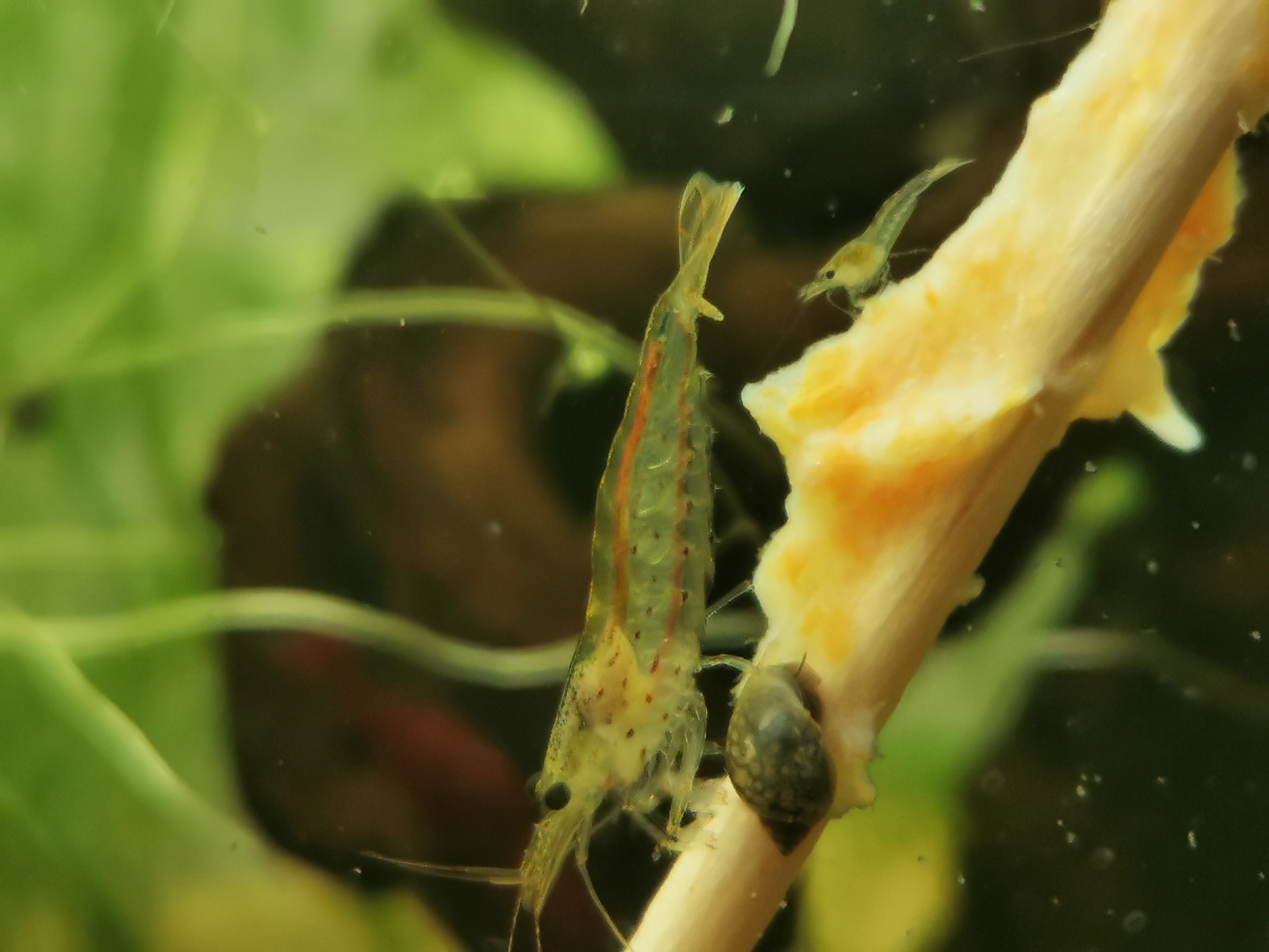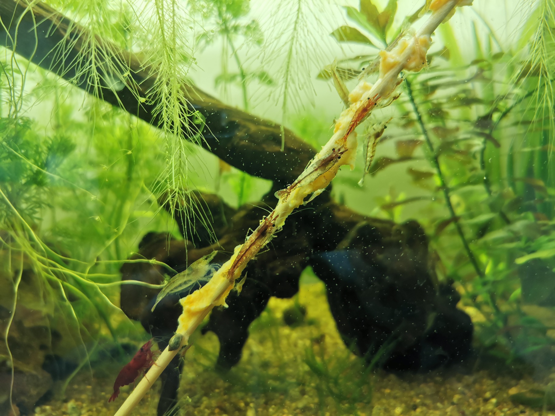Hier j'ai fait mon premier test de lollies pour crevettes. J'ai pris un pic en bois que j'ai trempé dans de la purée de carotte/patate. Elles ont adorées, même les juvéniles qui ont déjà bien grandi étaient dessus.