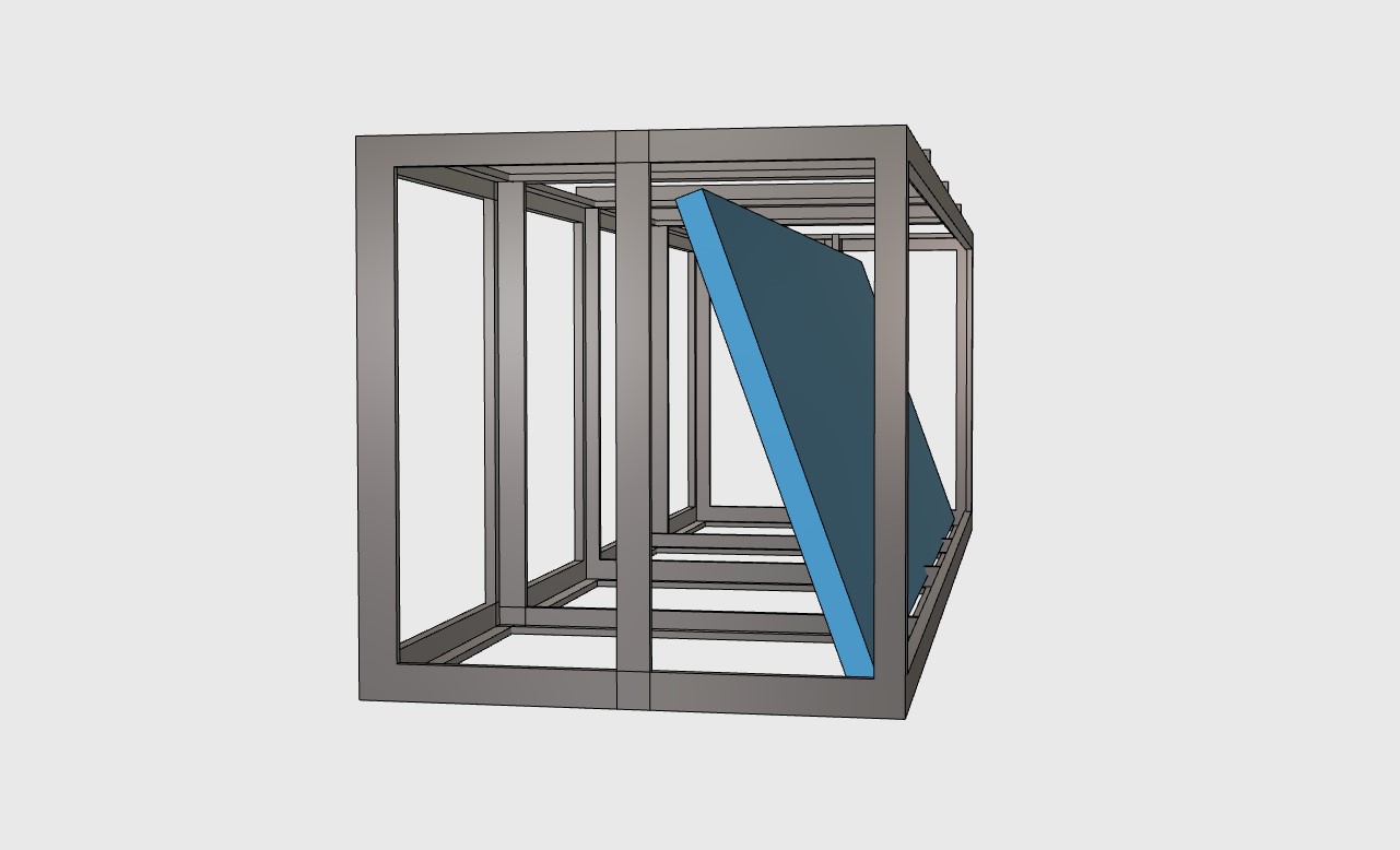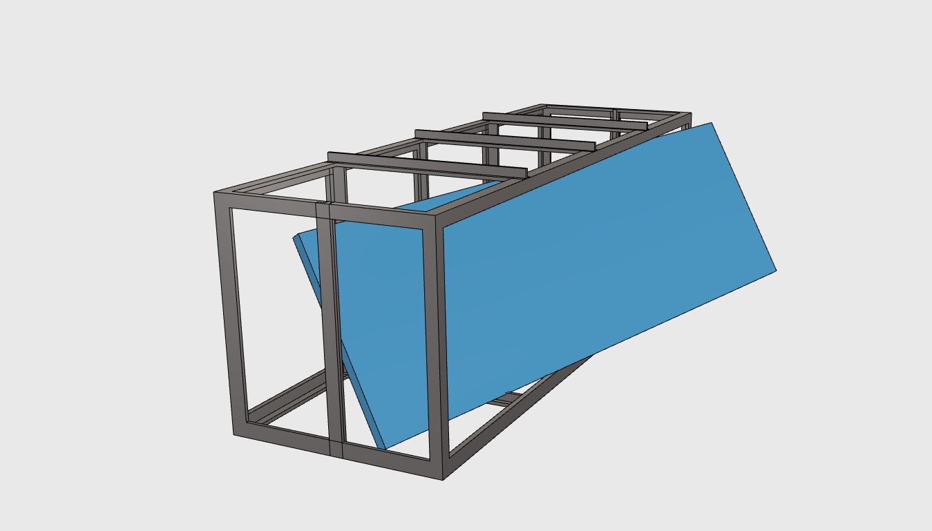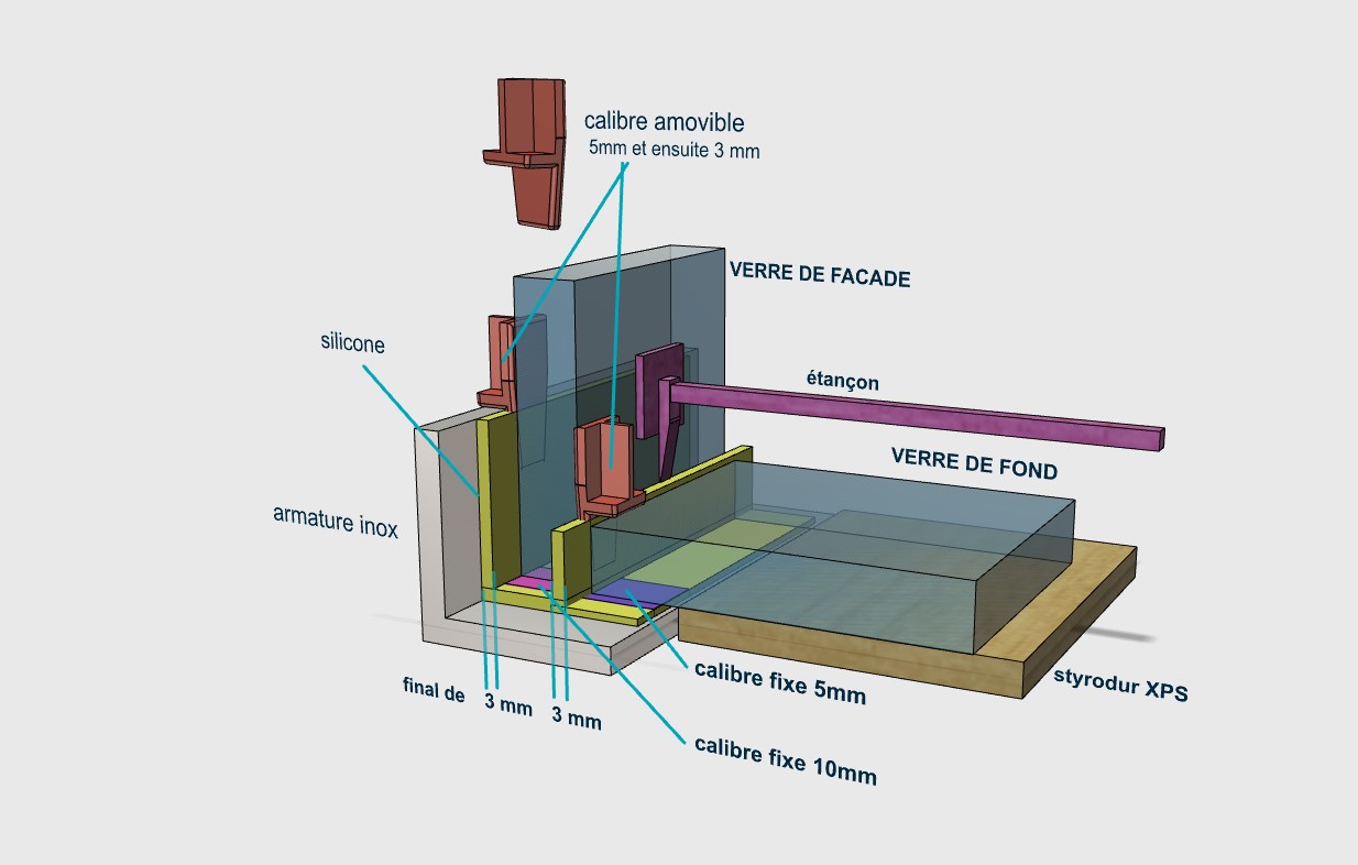 La plaque avant reposera sur des calibres PLA flex noyé dans le silicone de 10mm de hauteur. En effet, pour permettre de redresser cette épaisse plaque de verre après son introduction dans l'armature, il a fallu prévoir une tolérance verticale entre verre et cornière supérieure de 30mm , alors que pour les autres cotés, cette tolérance est de 10mm. Cette distance de 30mm a été répartie entre 10mm en bas et 20mm en haut. Les plaques de fond reposeront sur un joint calibré à 5mm. ceci pour que l'épaisseur de la cornière + le joint + le verre soit compatible avec l'épaisseur du panneau Styrodur xps qui servira de soutien à la plaque de verre (élimination du porte à faux).