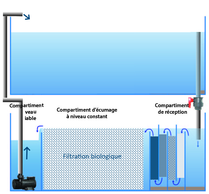 Décante, j'ai réellement déjà donné et n'ai pas trouvé cela top pour les gros volumes. Elle est d'ailleurs objectivement composée des mêmes éléments : pré-filtre, filtre et pompe. sauf que ... il faut bien être conscient que 10 cms d'eau dans le bac représentent 300 litres. Décante d'une taille obligatoirement adaptée aux gros volumes ( il faut de la place) , bruit de succions (grand débit), pré-filtre en mousses de tailles adaptées au volume, c'est à dire grandes et lourdes quand pleine d'eau et à nettoyer régulièrement, peignes de protections ( non représentés sur le schéma de la décante) qui s'encrassent trop vite à mon gout ( gros débit) , etc.. En cas de coupure de courant, débordement dans la décante (+ 300 litres) et donc obligation d'un système de trop plein fiable vers l'égout ( non représenté dans le schéma de la décante), avec la perte d'eau équivalente ( 300 litres) et l'obligation d'en remettre ( encore 300 litres + arrivée d'eau d'un calibre adapté non représentée sur le schéma de la décante) avant de pouvoir relancer le système. Il faut donc être présent, faute de quoi, la partie biologique souffrira d'un arrêt trop prolongé ( bonjour le re-cyclage des nitrites/nitrates). Ah oui, il faut aussi prévoir une protection fiable de la pompe de remontée contre un fonctionnement à sec ( non représenté sur le schéma de la décante) lors de la remise du courant, tant que le niveau n'aura pas été réajusté. et aussi : calculer une parfaite adéquation entre le flux d'entrée et la puissance de la pompe pour éviter soit un débordement de la décante ( pompe pas assez puissante) ou l'inverse si la pompe est trop puissante et grillera à sec après avoir vidé son compartiment ET pourrait faire déborder l'aquarium. attention aussi à la vanne qui peut s'encrasser ( ou réceptionner un poisson malicieux) et faire varier le débit d'entrée. etc... Une décante gros volumes n'est pas nécessairement un long fleuve tranquille.