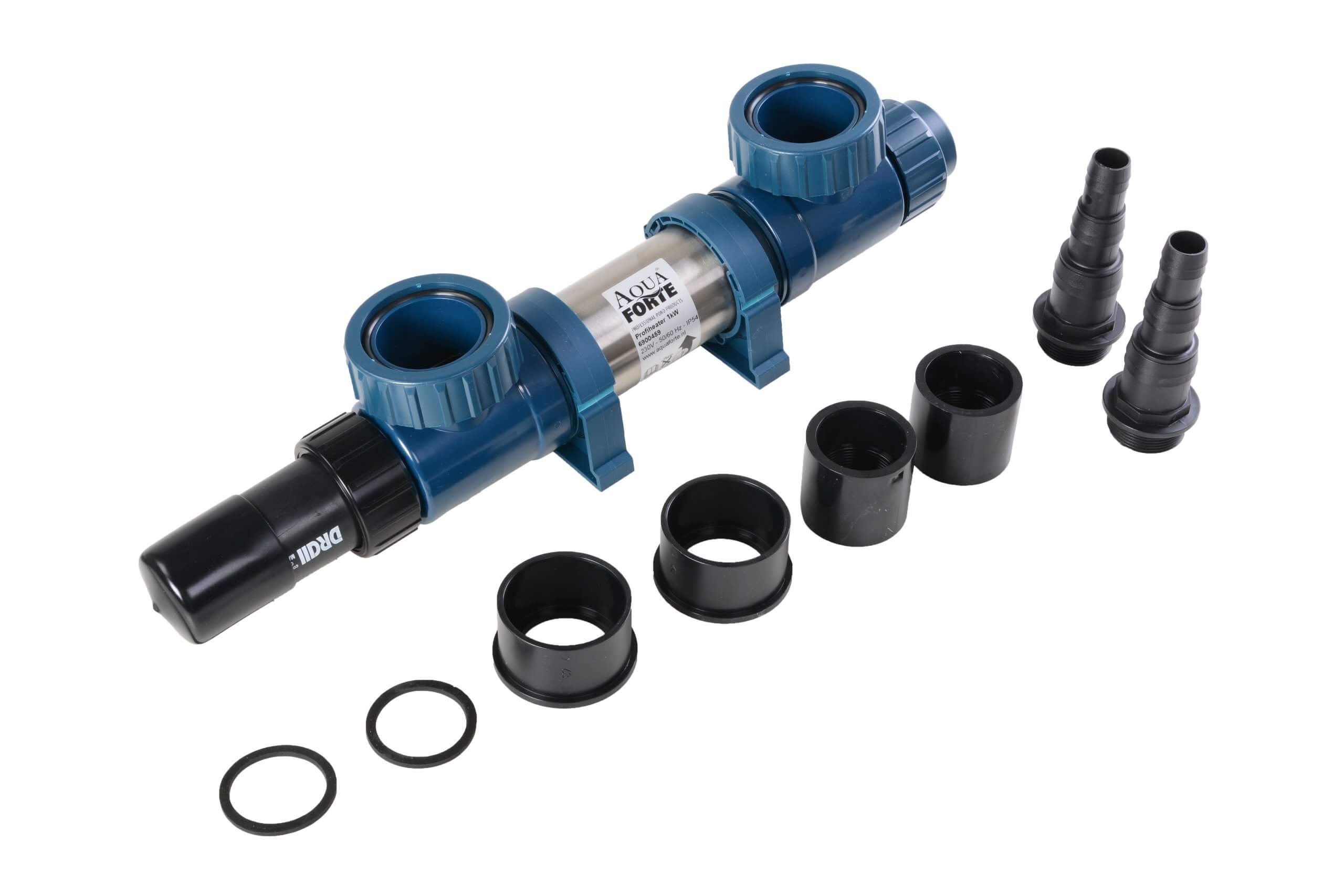 1/ Une unité UV Power UV-C 40 Watt T5 AquaForte sera utilisée ( n°11 sur le schéma). Elle a un corps en acier inox de longueur importante et un ballast électronique. Elle sera pilotée par une horloge de manière à ne pas la faire fonctionner en permanence. La durée de fonctionnement reste à définir.  nb : rigolo de constater comment certains sites, sous couverts de documenter son usage, en font le procès.