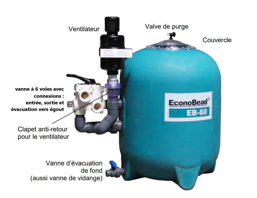 Elle met l'eau sous pression avant qu'elle ne soit injectée dans le filtre proprement dit (6). Celui-ci est une adaptation d'un filtre de piscine où une des modification a consisté à remplacer le sable par des billes spéciales. Le choix s'est porté pour le modèle econobeads EB-60.