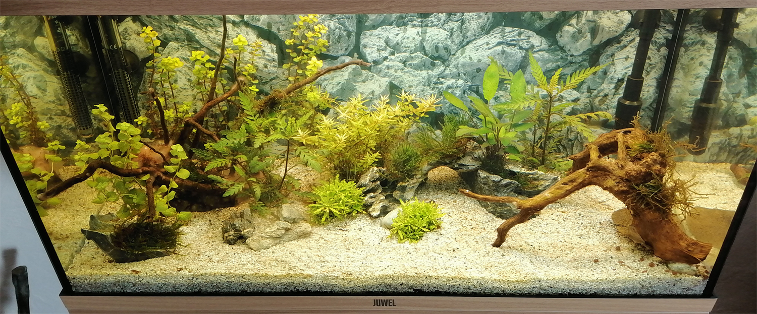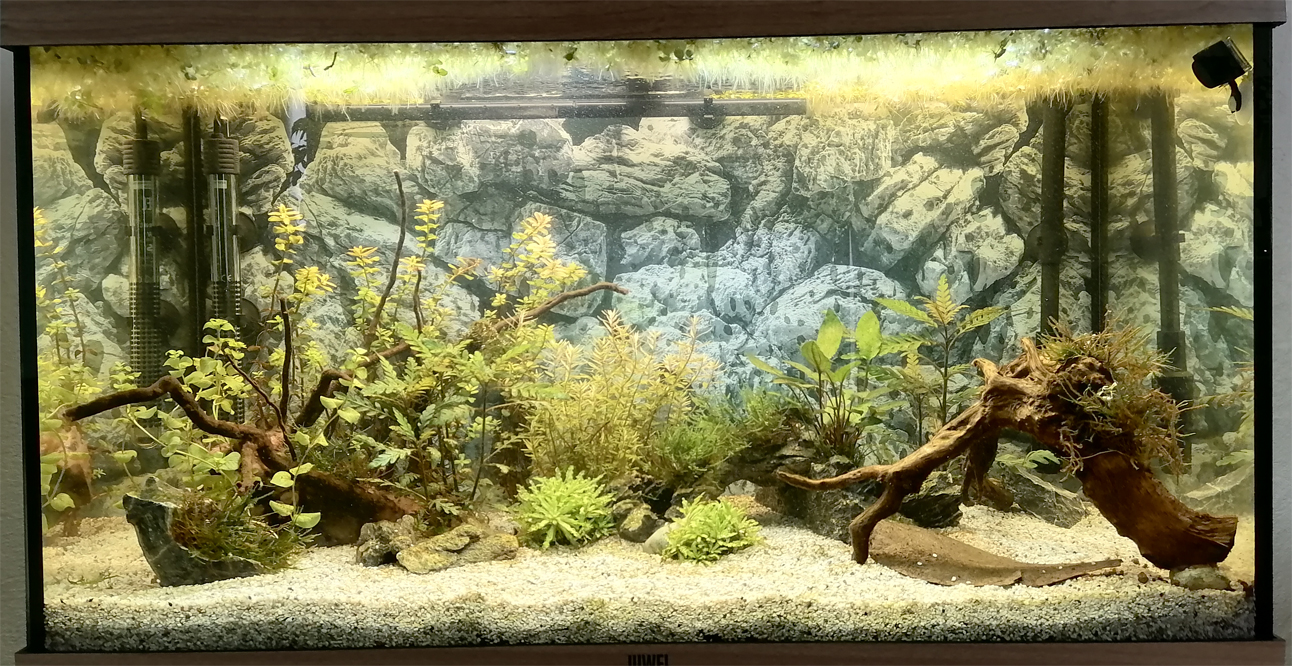 J'ai voulu faire une sorte de L où il n'y aurait pas de plantation, histoire d'avoir une aire dégagée. Par contre, si les plantes ont une bonne croissance, je souhaite planter de nouvelles pogostemon helferi. Je songe également à mettre une plante de surface. De la lentille d'eau ?