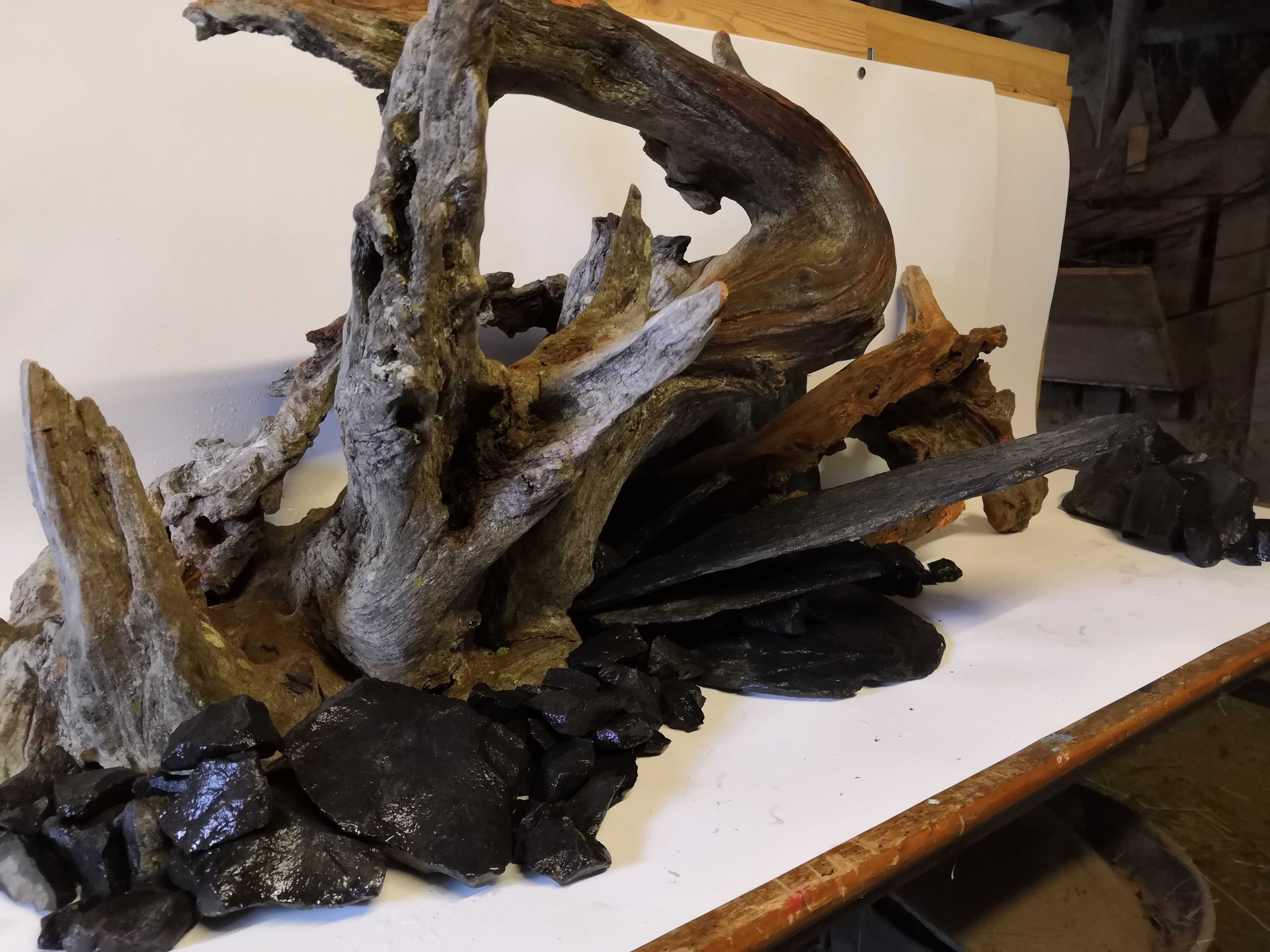 Jebeddo : ça tient plutôt bien car coincé sous la souche, mais je fixerais tout ça de toutes façons au montage. L'inconvénient de ce type de souche, c'est qu'elle flotte. Je les fixe sur des lauzes d'ardoise découpées à façon.