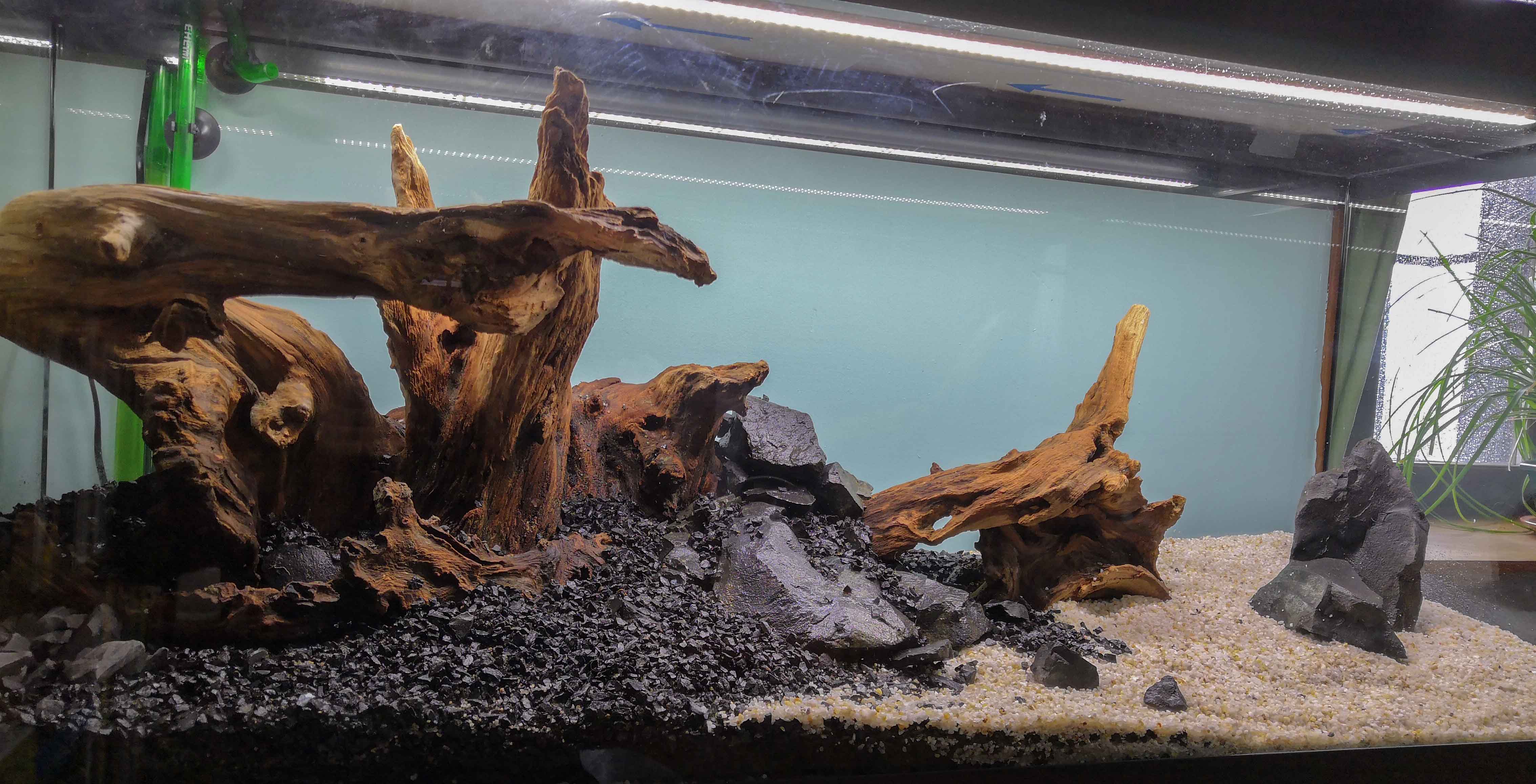 Je pense à des valisneries sur la gauche en arrière plan, des fougères sur la souche avec quelques touche de mousse, des cryptocorynes à droite au fond, deux couleurs si possible, ensuite des riccies sur l'éboulis et devant à gauche et droite une gazonnante. Je laisserais un triangle nu au centre depuis le milieu gauche jusqu'à l'arrière droite. Ce n'ai qu'une suggestion de présentation, non contractuelle !