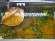 Lumière : Durée de l'éclairage : 10h00 (Température de couleur : env. 8000°K - Intensité lumineuse maximale : 3450 lumens Intensité de l'éclairage réglé sur 40% avec lever/coucher du soleil étalés sur 1 heure x 2. Eau (20 litres) : 1) Dureté totale - GH : 8 (augmentée grâce à des sels reminéralisants) 2) Dureté carbonatée - KH : 6 3) Potentiel Hydrogène - pH : Pour le moment, je suis entre 7,5 et 8 alors que j'étais stable à 7 depuis toujours. 4) Ammonium - NH4 : 0 5) Nitrites - NO2 : 0 6) Nitrates - NO3 : 0 7) Phosphates - PO4 : 0 8) Fer - Fe : 0 9) Potassium - K : ? Alors là, j'ai été bête, j'ai acheté un test version "refill" et il me manque une éprouvette, celle que l'on pose sur la croix 10) Magnésium - Mg : 8 Température : entre 26° et 30° selon les jours. Je n'ai pas les tests de silice mais il doit y en avoir pas mal car je refais des changements d'eau depuis quelques semaines à l'eau de Volvic et elle en contient. Donc, ce que tu vois au sol est un dépôt de diatomées. Filtration : Aucune, il y a une pompe externe qui tourne à vide pour créer un peu de courant car un matin en soulevant le couvercle de l'aquarium, il y avait des bulles vertes et gluantes en surface de l'eau. C'est aussi à ce moment que j'ai repris les changements d'eau aux environs de 2 litres par semaine. Alimentation du poisson : Uniquement de la nourriture vivante, il n'a RIEN qui soit mort. Photo du mois de mai :