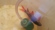 Malheureusement son état a empiré. Il est toujours dans le sceau et ne bouge presque plus et les plaque et truc blanc qui dépassent ce voient encore plus et la nageoire dorsale est rongé ( la ou il y a avait la trace ) Malheureusement mon labeo est condamné mais je veux savoir comment s'est arrivé et voir si personne d'autre n'est atteind. Il y a mon ancistrus qui est de colère à moitié mais j'ai déjà vu ça il y a plusieu r mois et c'est redevenu normal.