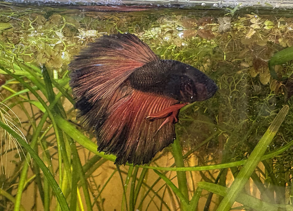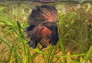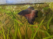 Chez un Truffaut que je ne connaîs pas, j'ai craqué pour un Betta (noté "crown tail" alors que c'est un "half moon"). Il croupissait dans un des petits boxes de 1l un peu cracra, les autres avaient des nageoires bien moches. Lui est en forme et superbe, je l'ai mis dans le 30l rempli de sagittaires où se trouvait - accidentellement- le triton, après avoir changé 1/3 de l'eau et fait un peu de place. Il est ravi du lieu et a l'air de bien se porter, pour l'instant je n'ai pas remis le chauffage, il est à 23-24°C. Photos ci-dessous de Automne le Betta et du microbe teigneux (image moche, issue d'un petit film)