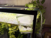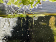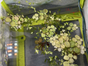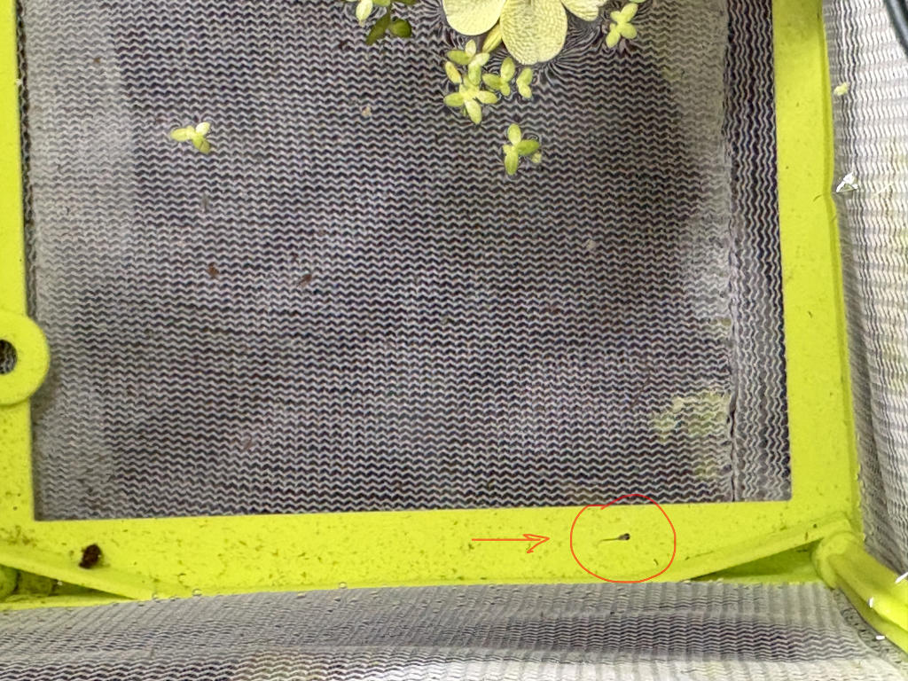 J’en ai vu un ce matin ! Toujours au même endroit, à godiller près de la spraybar. Cette fois pas d’hésitation : hop, en nurserie! Une tête d’épingle avec une queue, un ou deux millimètres tout mouillé, ce sont ses yeux dorés qui l’ont trahi. Plus petit que les signifer, c’est bien une gertrude. Un cadre en plastique avec un filet, fixé artisanalement le long du bord du bac. Comme ça l’eau circule, et c’est à proximité du bulleur nocturne. Un pouet d’algues avec ostracodes et micro daphnies, une planorbe pour le ménage, des flottantes dont lentilles trilobées. On  pour que j’en trouve d’autres avant les estomacs à écailles !
