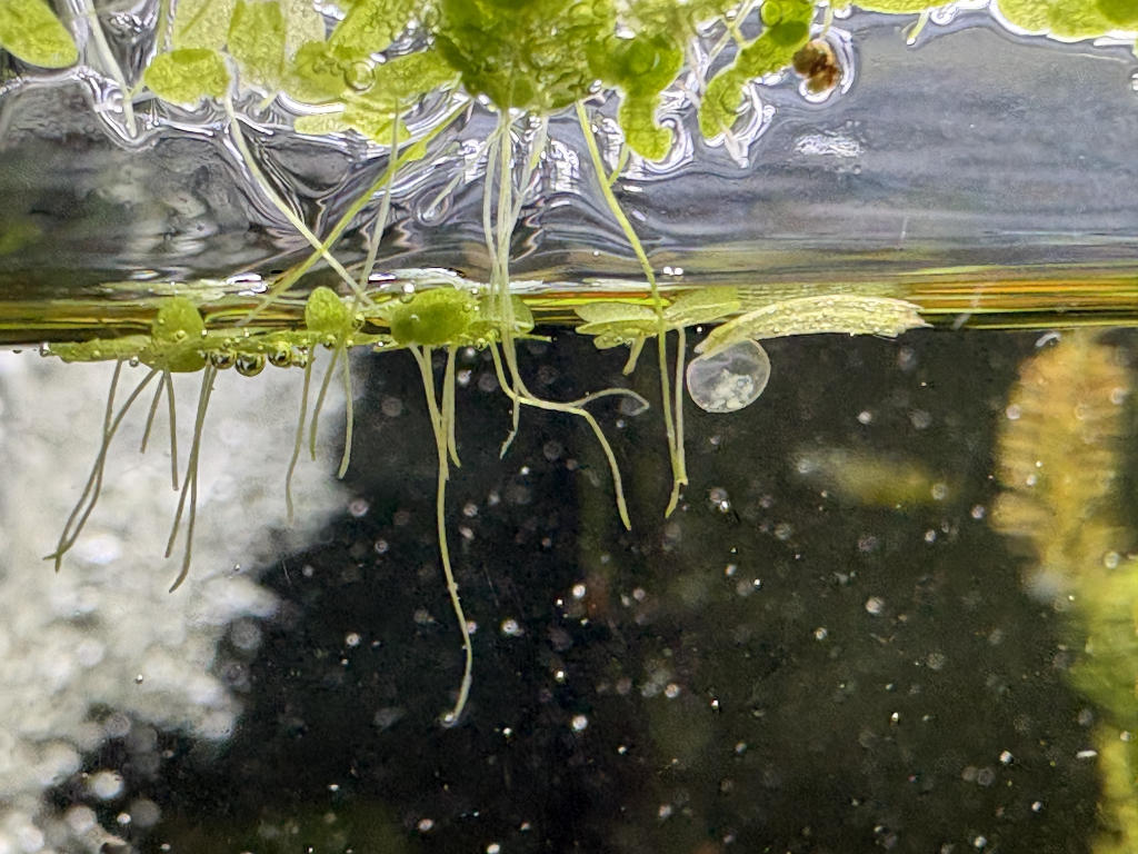 Katastro-pheuuu ! Je viens de finir le nettoyage et changement d’eau du 360l, en pestant contre ces grmlbl de filamenteuses de compet’ empêtrées dans les flottantes et les agglutinats de lentilles d’eau, virées sans ménagement. Nettoyage des prefiltres, remise en route avec pompe de brassage pour re distribuer l’eau propre uniformément, à la grande joie des raquettes. Je jette un œil pour voir si une grosse femelle gertrude qui n’avait pas l’air en point allait mieux. J’ai même pu la prendre à la main pour la déplacer, c’est dire. Et là qu’est-ce que je vois godiller tant bien que mal dans le courant du brassage : une minuscule virgule ! N’ont pas chômé les petits mâles Pseudomugils arrivés il y a 3 semaines, je les croyais trop jeunes, bah non.  Il n’a pas plus d’une journée, peut-être né cette nuit.
