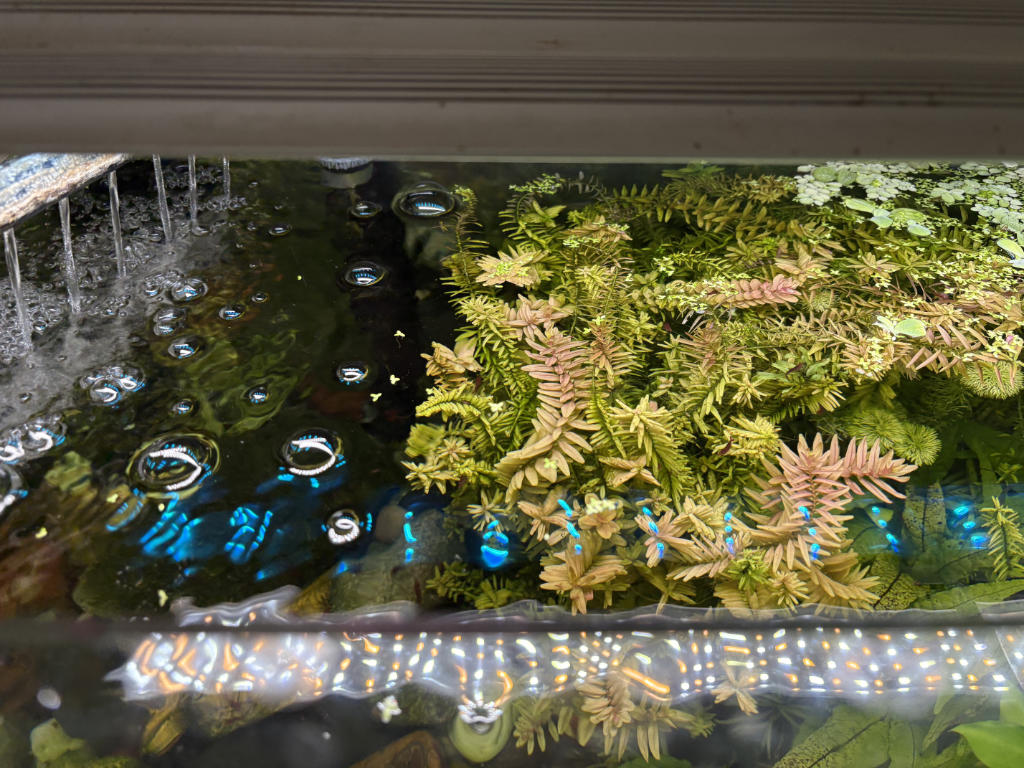 Et de trois. J’ai vu le petit mâle Gertrude dominant faire un saut de saumon par-dessus les rotalas! Il a attrapé quelque chose, et tout à l’heure je l’ai vu clairement gober un truc dans les rotalas aussi. C’est quand j’ai mis en route la pompe de brassage que j’ai vu une petite virgule se diriger habilement à l’abri des flottantes. Comme le petit mâle revenait à l’assaut j’ai jugé plus sûr de mettre le pioupiou avec ses copains.