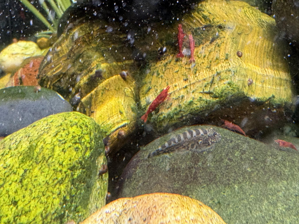 La pompe : c’est parce qu’un des deux scitulus adultes restant, ceux d’Estalens de 2022, a l’air mal en point. Il reste plaqué au fond, j’ai déjà vu ça avec d’autres. Pas de rougeur particulière, il n’est pas maigre ni pâle - enfin un peu plus que l’autre sans que ce soit très net, mais ventile beaucoup. Rien de visible physiquement, on le dirait juste à bout de course Le lot à environ 3-4 ans, il en reste encore un tout à fait en forme (et le petit Barnabé de chez ADS, qui doit avoir un an), et les deux zebrinus qui elles sont particulièrement actives ; ça leur arrive progressivement. Ils commencent par sortir de moins en moins de sous les galets, puis se collent au fond le long de la vitre en ne bougeant plus.  Les deux crenastus et l’hypergastromyzon sortent plus souvent et vont bien.