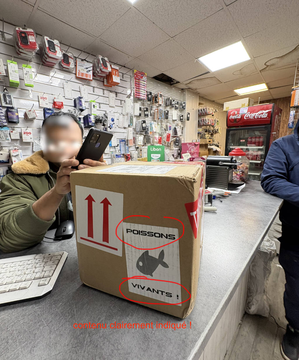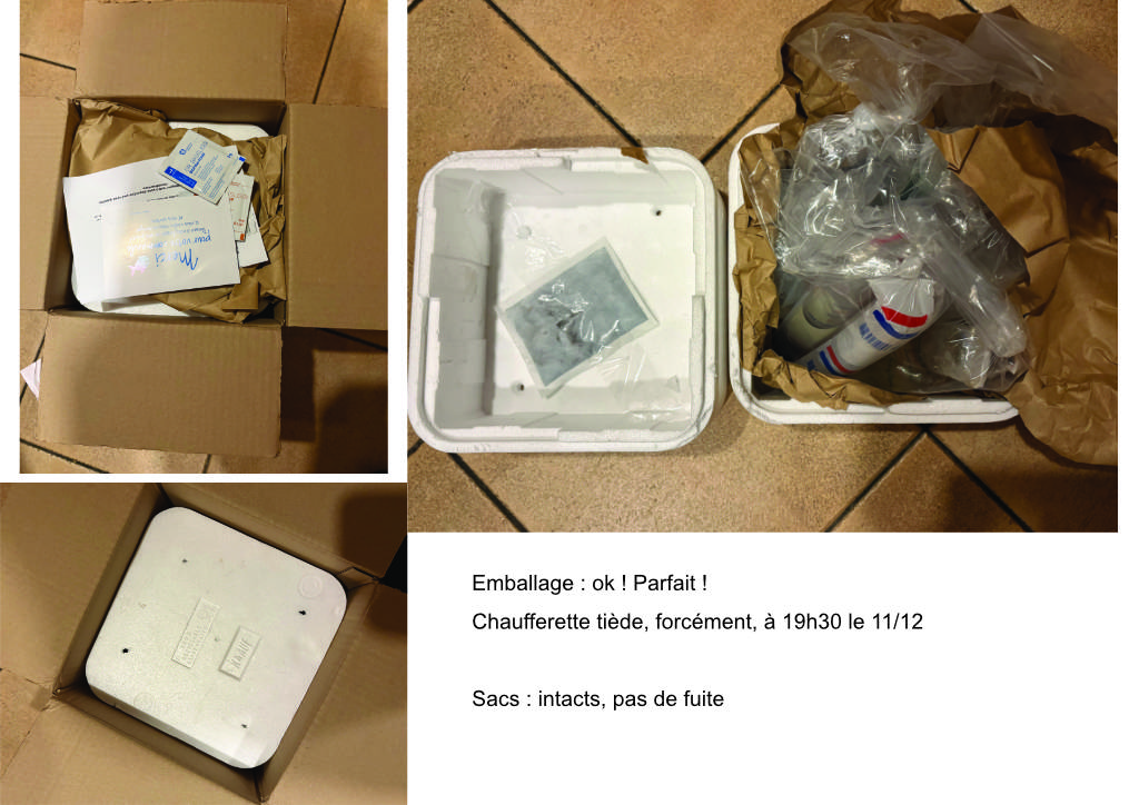 - Vers 19h, le gérant du relai m’appelle pour me montrer une camionnette banalisée et 2 livreurs devant la boutique, en train d’étaler les colis sur le trottoir, pour me dire d’aller directement leur demander (il avait compris que je tenais à faire vite, pour retrouver le contenu vivant).
