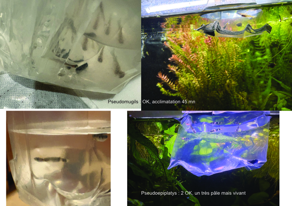 - la chaufferette tiède. Normal vu le temps mis par UPS pour livrer. - un pseudomugil ventilant rapidement en surface après les 45mn d’acclim’. Connaissant ces poissons très fragiles et émotifs, j’ai vérifié ce matin : ils sont tous là, en forme. Ouf. - un petit killi , après les 25-30 mn d’acclimatation, un peu maigrichon et pâle, qui n’a pas mangé ce matin. Je le garde à l’oeil. Les autres sont passés comme des flèches et sont repartis dans la végétation, impossible de les observer mieux. Ils ont mangé donc ok.