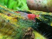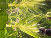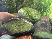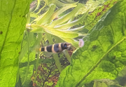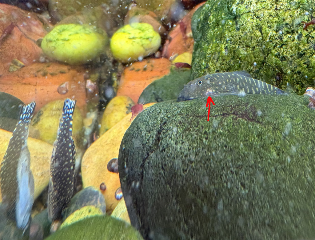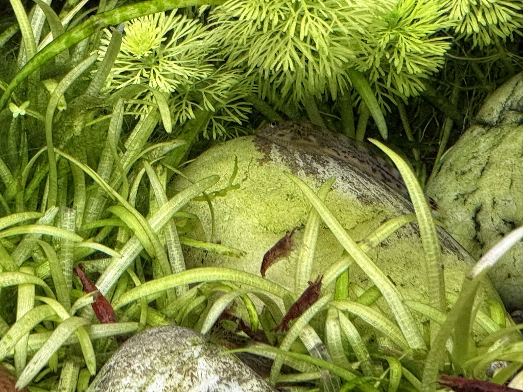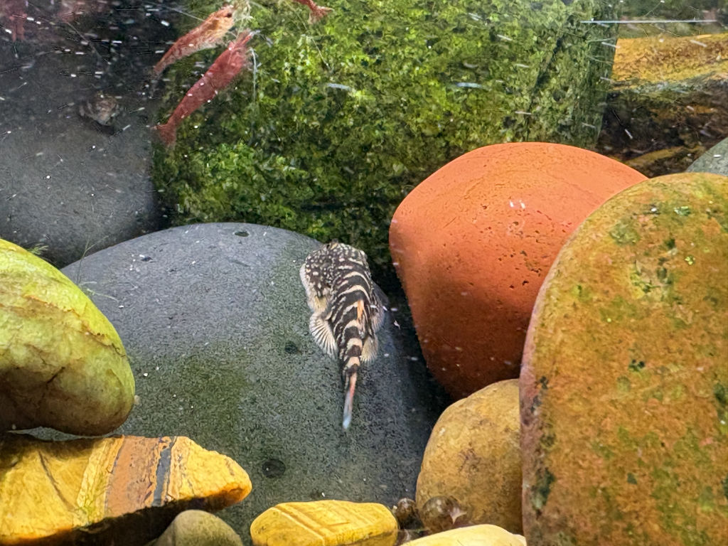 Il est plutôt en forme, ici vu du dessus, puis en mode "camouflage". En effet, j'ai noté que comme l'autre, il bouge peu, puis se jette brusquement sur les crevettes. Plus micro-carnivore que les Gastromyzons, on dirait ! Là, il a repéré le coin où se cachent les red cherry juvéniles !