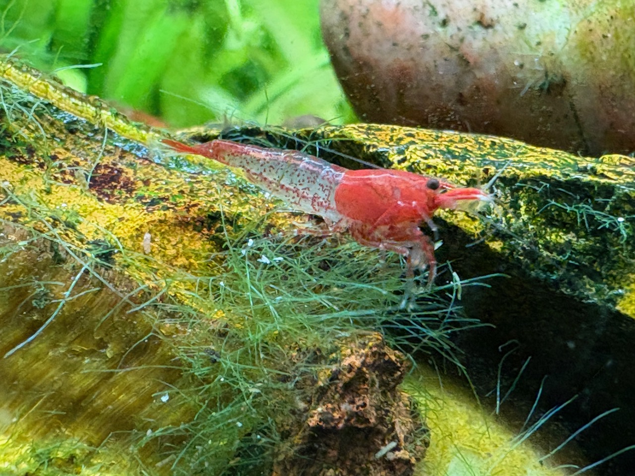Haha, je vois que le "nombre de poissons" peut poser problème chez toi aussi (hein, les rubras ?). Je ne vois que rarement tout le monde en même temps. Certains sont faciles à distinguer (les mâles à motif unique, les bandes des chenilles particulières, les déjà gros depuis longtemps comme les raquettes...), d'autres c'est impossible comme les femelles des gertrudes ou les rubras. Ou les crevettes !  Sauf celle-là :