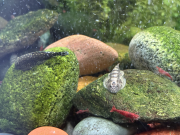 Depuis 2 jours, ça va mieux, plus de nitrite, mais un n°6 affaibli. Avec un bout de coton au bout d'une baguette en bois, j'ai doucement tamponné sa plaie au eSha 2000 dilué, pour éviter de le sortir. Il n'a pas trop bougé et s'est laissé faire la première fois. Le lendemain, moins, mais j'ai pu refaire. Hier matin aussi, là je laisse, la plaie est propre. Il est plutôt plus vif que la semaine de sa "ré-apparition" .  La grosse panda n'a pas l'air affectée par ses pelviennes rongées, elle gigote et mange comme si de rien n'était, c'est la seule les autres n'ont rien ; c'est "propre" et a l'air stabilisé, je surveille le tout mais ça a l'air de cicatriser. Les autres gastromyzons vaquent à leurs occupations comme si de rien n'était, les pseudomugils restant (Volo le signifer, les gertrudes environ 12) aussi. L'alevin Noël, mis 2 jours chez les boraras le temps de changer l'eau, remis ce matin dans son "parc à mioches" se porte comme un charme et a toujours faim. Pourtant, ça a été "plouf" à l'aller et au retour, sans eau quelques secondes, puisque j'ai soulevé sa cage !
