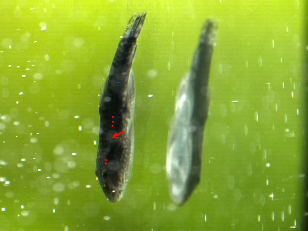 - après un bon repas (daphnies vivantes pour les nageurs, vers congelés pour ceux du fond + repashy pour les raquettes), un des 2 mâles restant Pseudomugils signifer fait des tonneaux la tête en bas.  Soit il a trop mangé, soit il est en fin de vie ! (1,5 an ! Dans la nature, c'est 1 à 2 ans, en aquarium 2-3). On verra demain, l'autre - son ex ennemi juré - reste à côté, depuis qu'il n'y a plus de femelle.