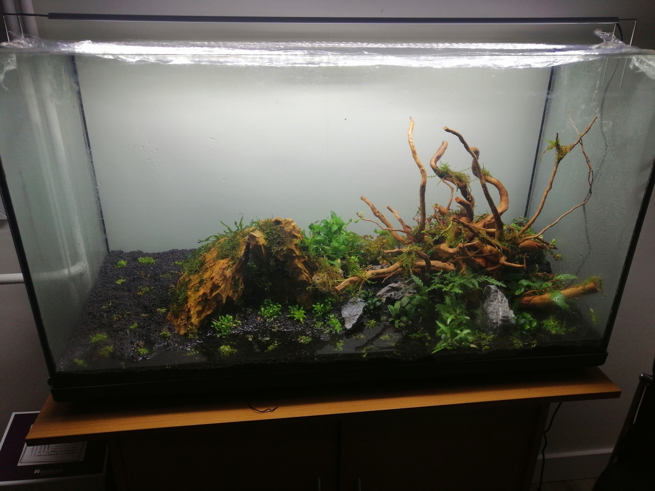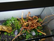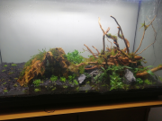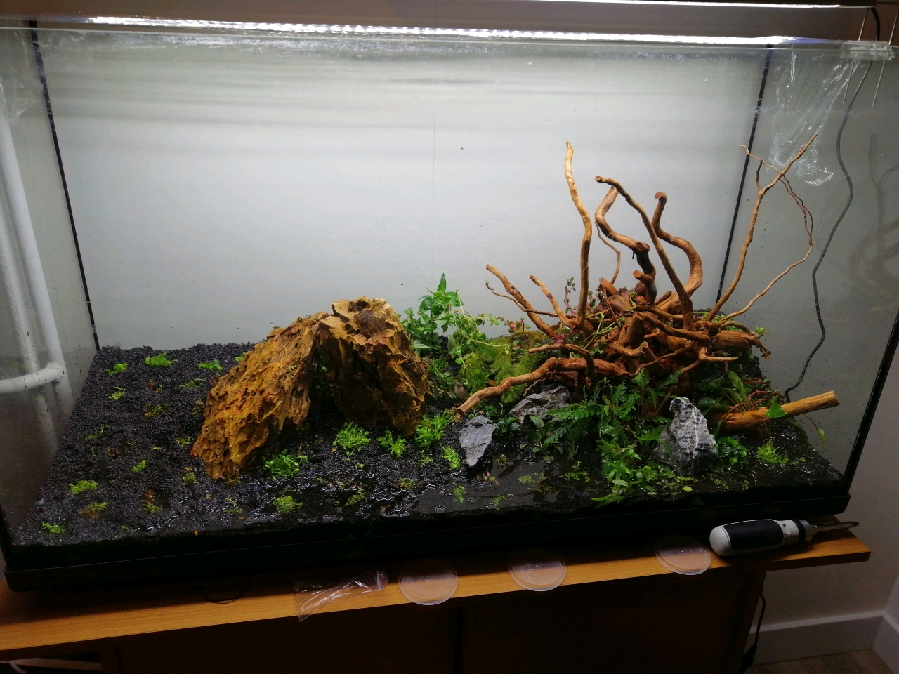 J'ai rajouté la Vesicularia montagnei 'Christmas' également sur "l'arbre" et sur les pierres cependant sur les pierres je les ai juste "posé" dans des crevasses ou autres et je me demande si ça va tenir à la mise en eau ou si je dois les coller ?