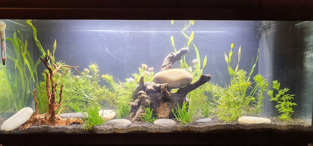 Sobre et sympathique. Surveille la reprise de tes plantes, les Egeria notamment (on dirait qu'elles ont pris un coup de froid), l'apparition d'éventuelles algues, le fonctionnement du filtre et du chauffage... et patiente.