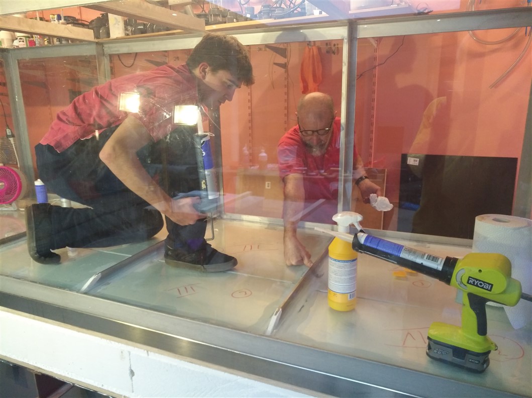 oh, que oui. je n'ai pas pu résister à tester mon éclairage ( deux rampes sur quatre). Il accentue la vision du gras sur la vitre, mais bon... je n'oserai plus le nettoyer de peur que le produit , en coulant le long de la vitre, n'interfère avec l'adhérence du silicone.  par contre, je vais passer de l'acétone sur la partie qui recevra le silicone. L'espace entre armature et verre est suffisant pour y insérer une spatule recouverte d'un papier "essuie tout" imbibé.