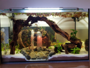 Pourquoi vieillirait-il mal ?  Il y a du bois, de la terre, du sable, des cailloux non calcaires, du silicone d'aquarium et des plantes naturelles, comme dans tout autre aquarium. Il y a une lampe led submersible derrière le décor que j'ai réglé sur orange mais on peut mettre bleu turquoise ou autre.