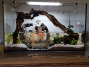 Je le ferai demain, on ne sait jamais. Les deux autres petites écrevisses se portent bien, une crevette red cherry aussi (accrochée manifestement aux plantes lors d'une transplantation), deux autres escargots décoratifs et quelques dizaines de physes gambadent joyeusement.