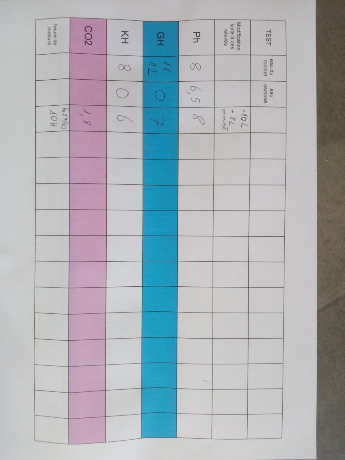 Bonjour à tous, l'heure est grave, mes plantes ont faim. Hier je tests l'eau de mon aquarium avec une malette de test que je viens d'avoir. En effet mes plantes ont l'air de vivoter, voir même de stagner. Les résultats tombent: ph:8 Gh:7 kh:6 pas de nitrite Conclusion d'après un tableau de correspondance entre ph et kh: trop peu d'acide carbonique. Donc les plantes ont la dalle. C'est pour ça! Je me suis fais un tableau pour le relevé de ces paramètres, les modifications que j'apporte à l'eau, ainsi que l'heure des prélèvements. ça ressemble à ça (voir image)