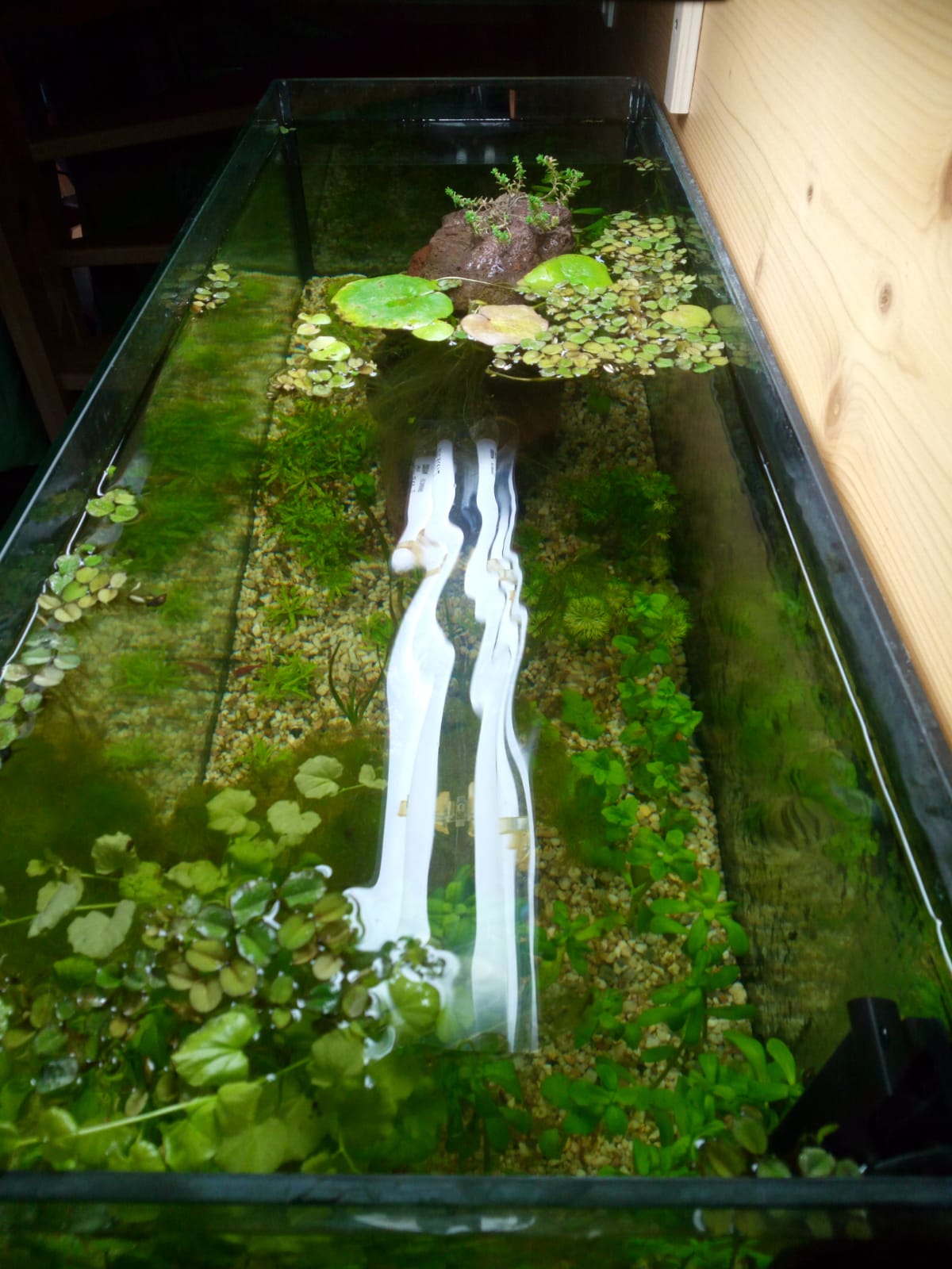 Sur celle prise de dessus, on peut distinguer l'image déformé par les ondulations de l'eau des néons qui se réfléchissent dans l'eau. Et pour info, ils sont allumés 2x 4h espacé d'une pause de 4 heures. On voit également le petite pompe en bas à droite de la photo.