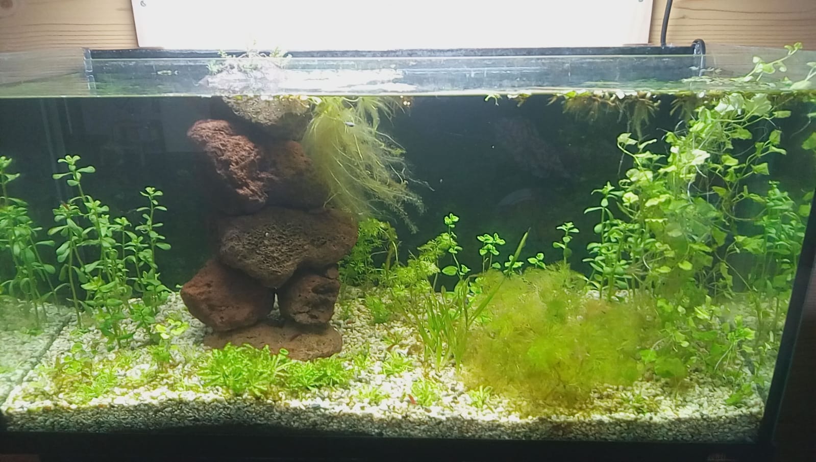 Bonjour à tous, je poste une petite photo de mon bac qui à 2 mois Les plantes ont bien pris, le clinopodium browney à été bien ralenti par des algues ainsi que les cabombas que je j'ai dû retirer en grande partie. Je lui ai laissé encore une chance avec 3 boutures saines. Mes limnobiums se sont fait croquer par les physes  . Les aselles se sont multipliées ainsi que les ostracodes, les daphnies et les physes bien sûr. Il reste 8 crevettes contre 10 au départ, dont une retrouvé séchée au pied de l'aquarium....voilà ce qui arrive quand on ne veut pas rester confiné avec les autres! Par contre, il y a 2 semaines, j'ai aperçu des hydres  . Les infos que j'ai collecté sur internet montrent que ce sont des saletés pour mes petites bestioles. Je pense que je vais être obligé de traiter au Dolthène, même si je ne trouve pas ça top. Mais ce qui est génial, c'est que ça grouille de vie et pas d'algues. Au niveau entretien, je vais simplement devoir contenir certaines plantes trop à l'aise.