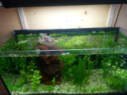 Bonjour JMJ. Je n'ai pas de filtration, juste une pompe de brassage de 80L/h qui crée de très légères ondulations sur la moitié du bac. Le bac est en eau depuis 23 jours.