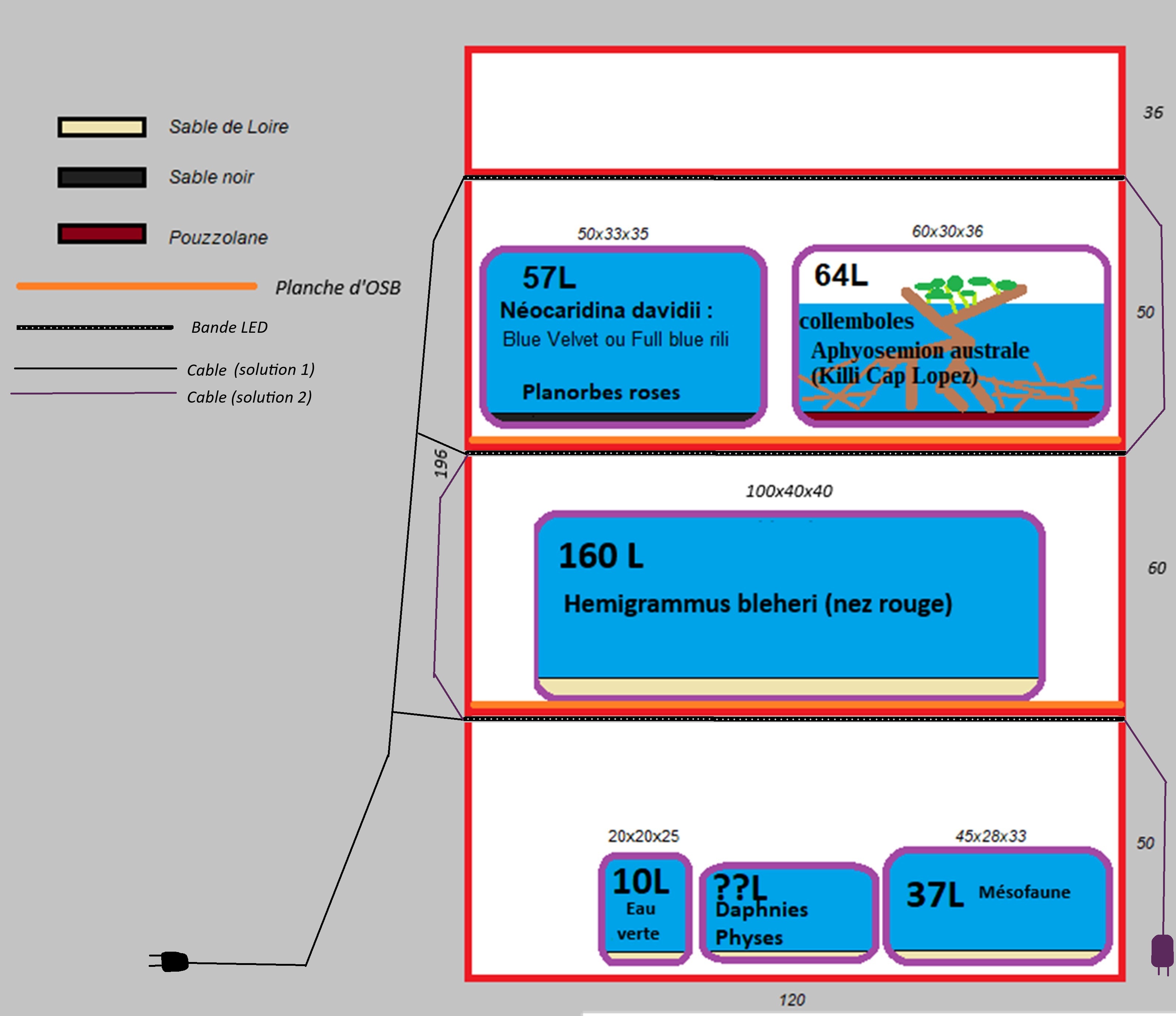J'ai aussi pour essayer de limiter la longueur des rubans LED sur l'étagère du bas (et économiser l'énergie et gagner un poil en écologie) réaménagé la position des bacs en échangeant la position du 37 et du 57 L (si cela est réalisable) , ce qui me demanderai deux planches d'OBS. je met le plan ici à jour