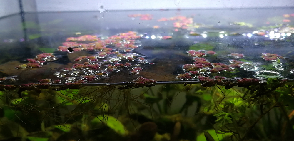 Une semaine plus tard, les Lemna trisulca ont déjà bien poussé. L'Azolla pousse aussi un peu, il y a du vert tendre et frais qui apparaît sur les bords, et qui tranche nettement avec le rouge du reste de ces petites plantes. Ce qui m'a étonnée par contre, c'est que presque toutes les racines de l'Azolla sont tombées au fond du bac... Par contre, voilà que j'ai un nouveau souci, pas bien grave je pense : voilà que des points blancs apparaissent sur les feuilles mortes. Je soupçonne de la moisissure, car aux derniers tests le pH était remonté jusqu'à devenir légèrement basique. Je me demande si c'est lié à l'EsayCarbo que j'utilise quotidiennement à faible dose depuis 2 ou 3 semaines.