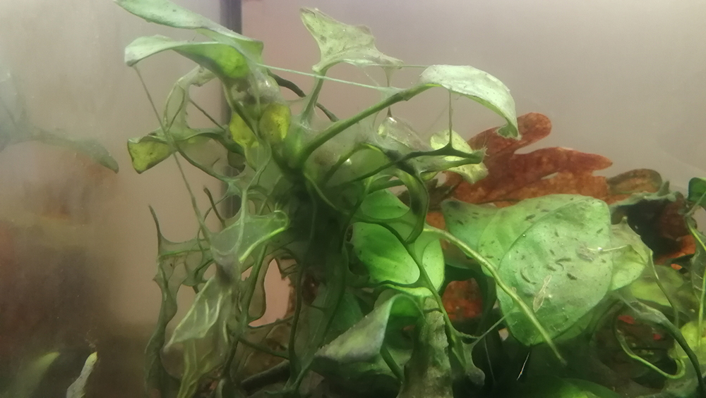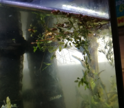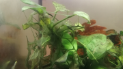 Les plantes repoussent bien, même les lentilles d'eau s'y mettent (il devait m'en rester 3 ou 4 dans un coin alors que du temps du bac précédent avec le Betta j'avais commencé à en virer une partie tellement ça pousse bien). J'ai commandé sur Aquazolla de la Lemna trisulca et de l'Azolla (caroliniana ? le genre exact n'est pas indiqué). Et j'ai déplacé ce qu'il reste de la fougère de Java devant la filtration, et la racine avec toutes les anubias de l'autre côté et au fond de l'aquarium, car elles ont plus de hauteur que le reste, et la weeping moss par dessus.