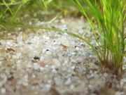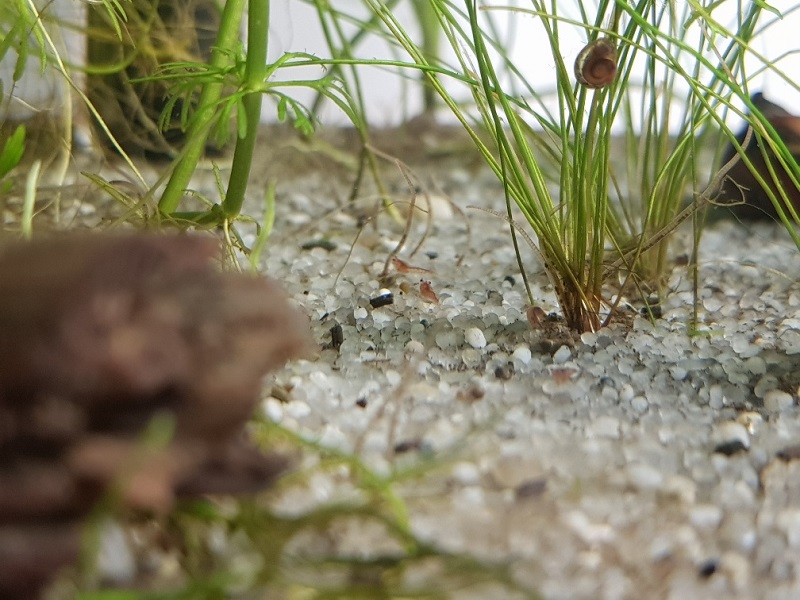 Aujourd'hui, un heureux évènement est arrivé. En faisant l'entretien, je me suis rendue compte qu'il y avait une 15zaines de bébés crevettes. Le betta n'a pas vu celles-là, ou elles se cachent bien, je ne sais pas trop, mais cela veut dire que j'ai donc hérité d'un couple. Il y avait une chance sur trois
