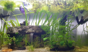 Tout à l'air de se maintenir pour le moment, ça me fait très plaisir. Très peu d'algues (parfois un fil de filamenteuse que j'enlève aussitôt) et surtout plantes qui se maintiennent et poussent pour certaines. J'ai même été obligée de faire un peu de taille de buisson, j'étais toute contente. Je trouve que le betta devient vraiment plus raisonnable maintenant qu'il est un adulte expérimenté. Il ne mange plus les antennes des escargots et ne mange plus les aselles trop grosses pour sa bouche. Il observe et choisit si c'est mangeable ou non. S'il décide que non, il s'éloigne sans agressivité. Je suis sûre qu'il pourrait vivre à présent avec des crevettes, mais je ne le ferai pas pour manque de place.