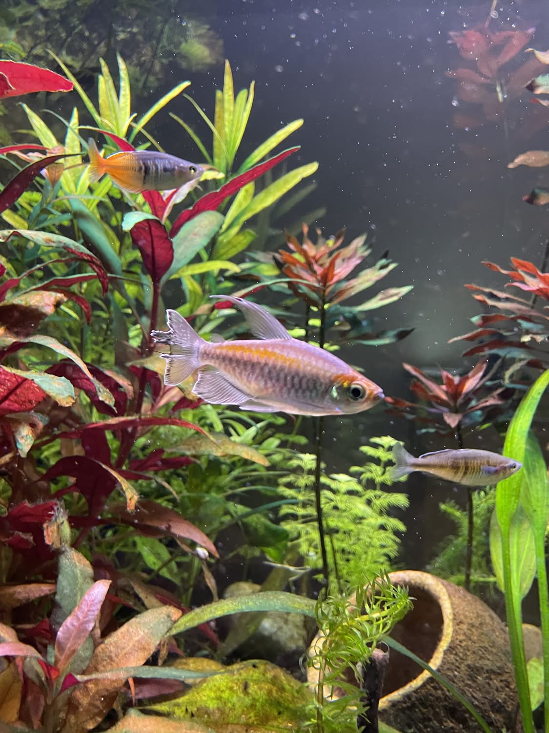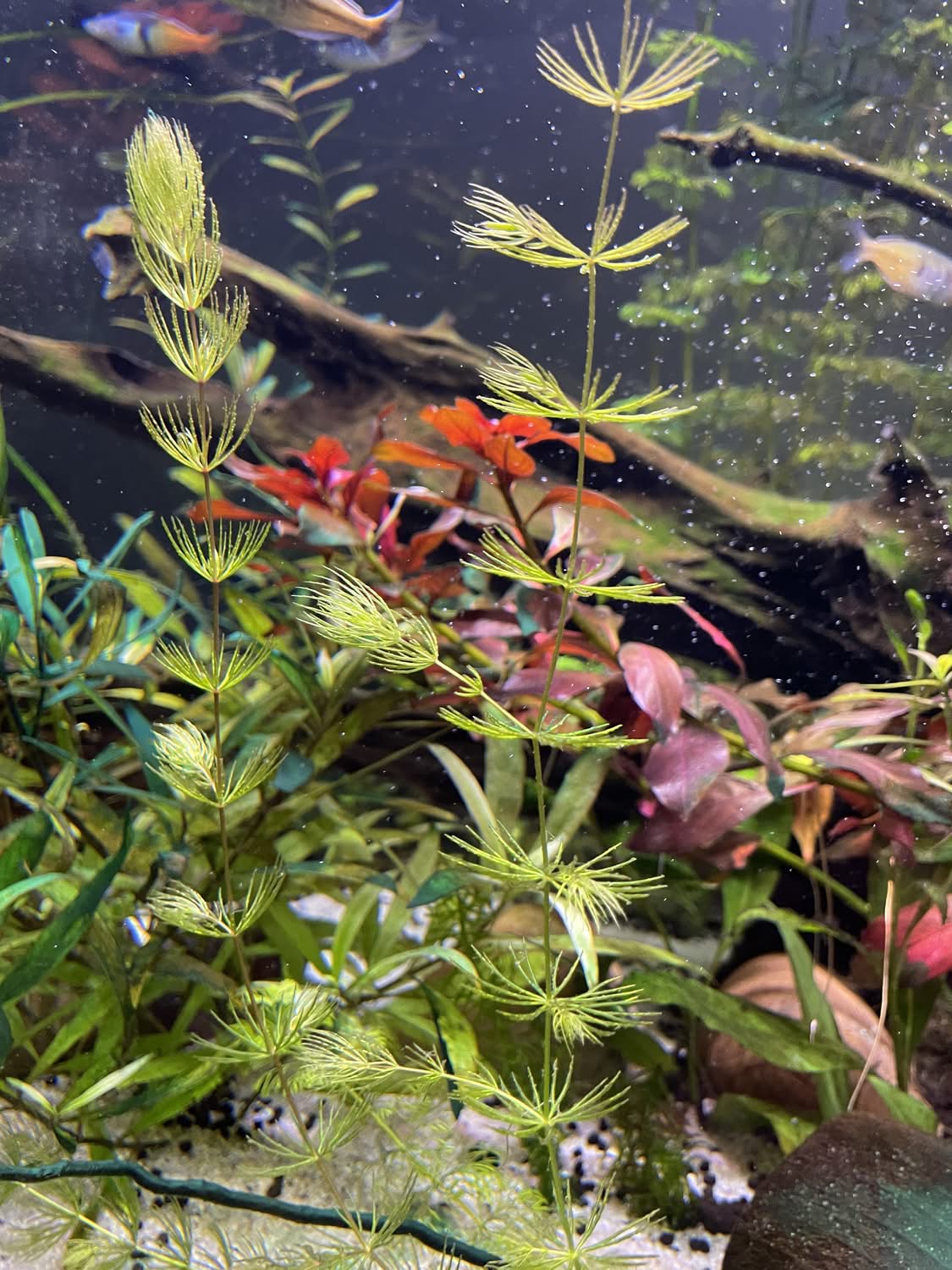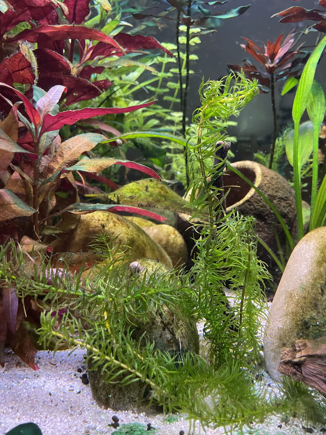 Opabinia: C'est des Boesemani, mais ils sont encore jeunes, ils sont petit et n'ont pas la forme finale, leur "double menton" est moins marqué. Ils commencent seulement à avoir un arc en ciel régulier. Le fil vert? Sur les élodées? Si c'est ce que je pense, ce sont des racines qui partent depuis la tige. Sur la Cératophylle j'ai utilisé du fil pour lier le pied, sinon je n'arrivais pas à le faire tenir dans le sol, mais on ne le voit pas il est dans le sable. Et d'ailleurs elle pousse extrêmement vite, en 3 jours elle était déjà plus grande.