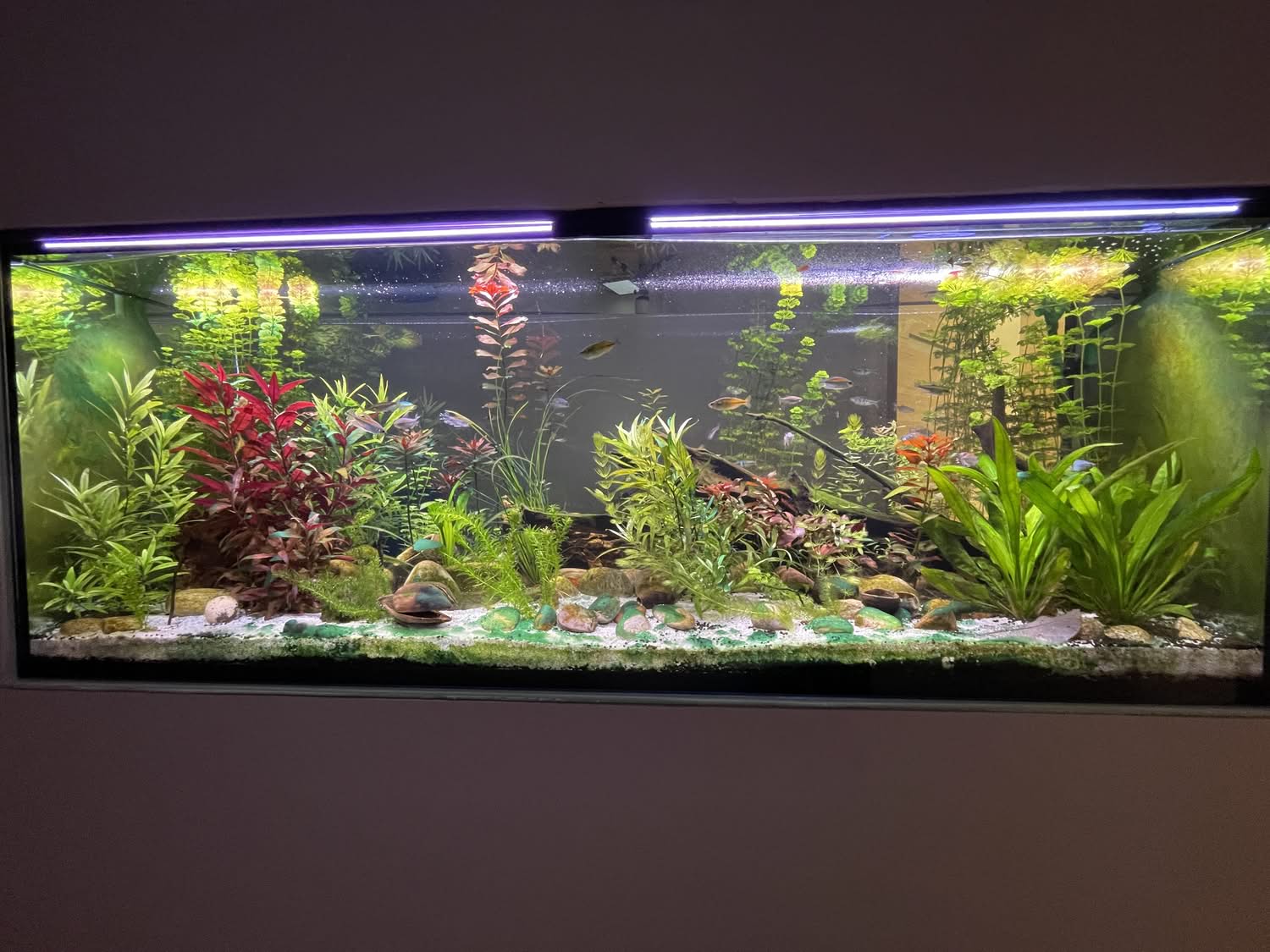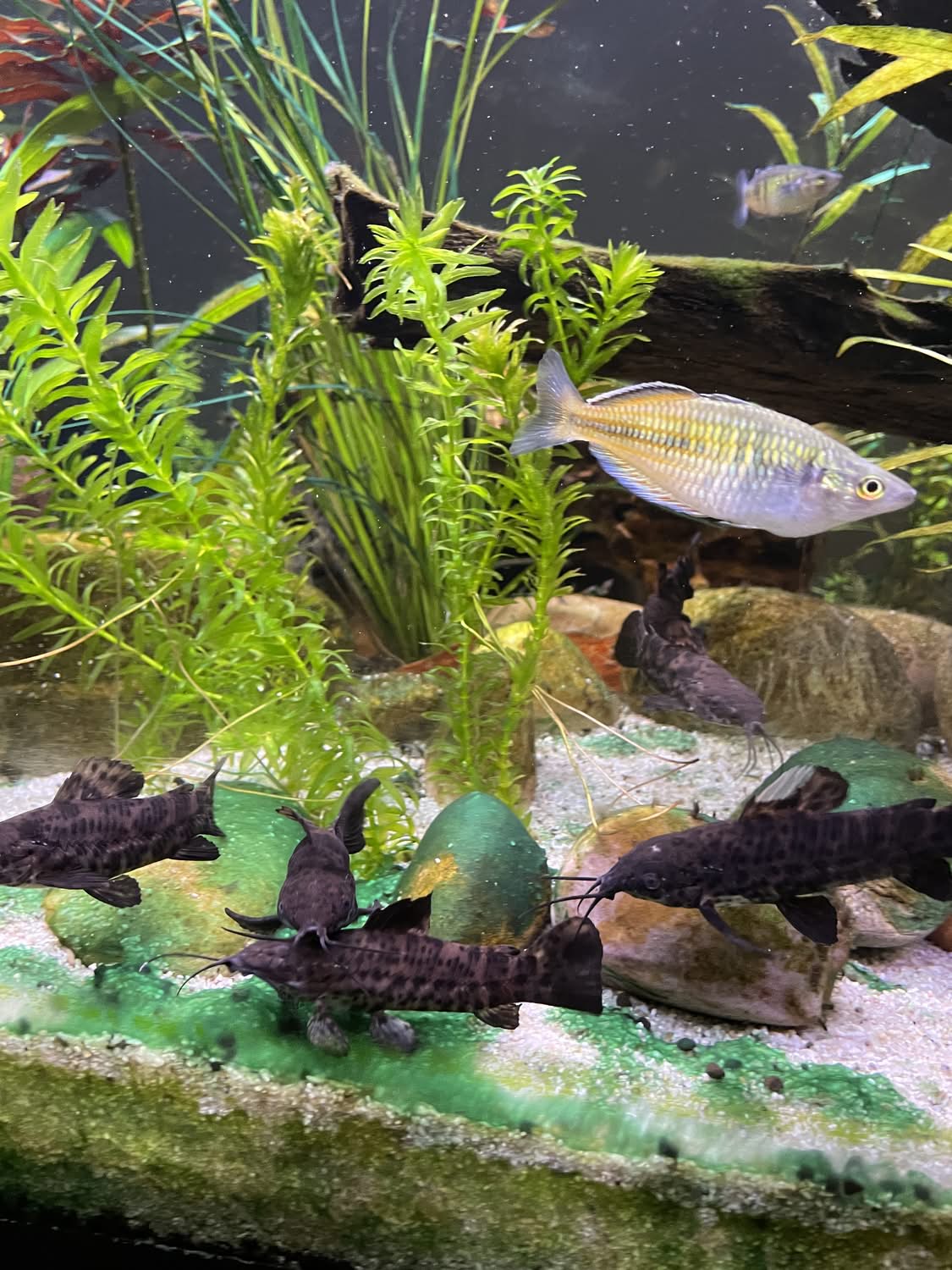 J'étais occupé, du bricolage dans la maison encore :) Le bac se porte bien, les poissons semblent paisibles, la flore étant dense ils ont l'air d'aimer fouiller, se cacher, dormir dedans, zigzager entre les plantes. Les Megalechis vont souvent faire une sieste posés sur une branche de Limnophila. Les autres n'ont pas l'air stressés, au dernier nettoyage et entretient des plantes ils venaient me manger la main, je pouvais presque les attraper. J'ai toujours des crevettes qui vivent dans leur racine et pas mal d'escargots qui sont revenus.